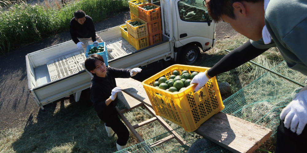 収穫に合わせて加工場もフル稼働。搾汁が進むにつれ、辺りはじゃばらの香りで満たされる。
