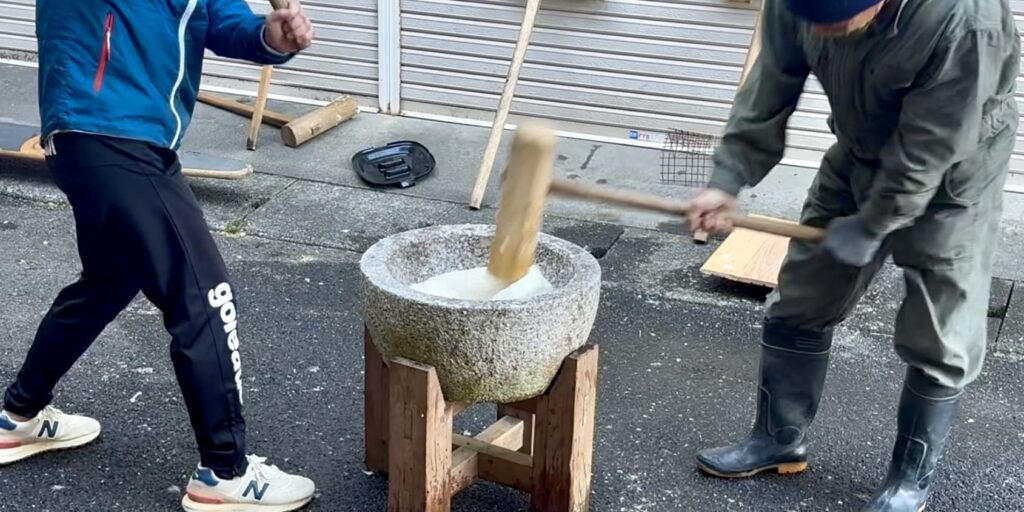 途中で少しだけ、杵を持って餅つきにも挑戦しましたが、お餅の弾力が想像以上に強く、素早くつくのはなかなか難しかったです。