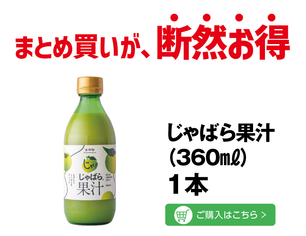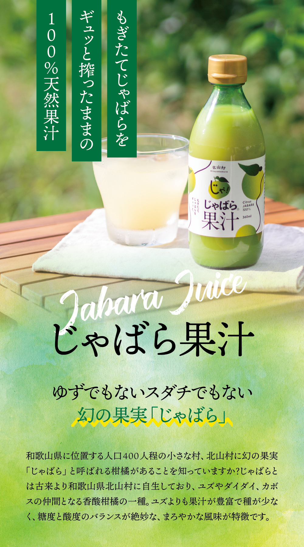 和歌山県の小さな山村「北山村」に、柚子でもない、スダチでもない、とんでもない、へんなみかんが1本だけありました。その名は「じゃばら」。鬼も逃げ出す酸っぱさからか、はたまた松のような不思議な香りがするからか、それは定かではありませんが「邪気を払う」、そんな意味でこう呼ばれていました。たった1本の木から、過疎化の救世主として大事に、大事に育てられ、今ではその数なんと7,000本!じゃばらは、さまざまな加工品となり、山奥の村から皆様のもとへお届けさせていただいています。