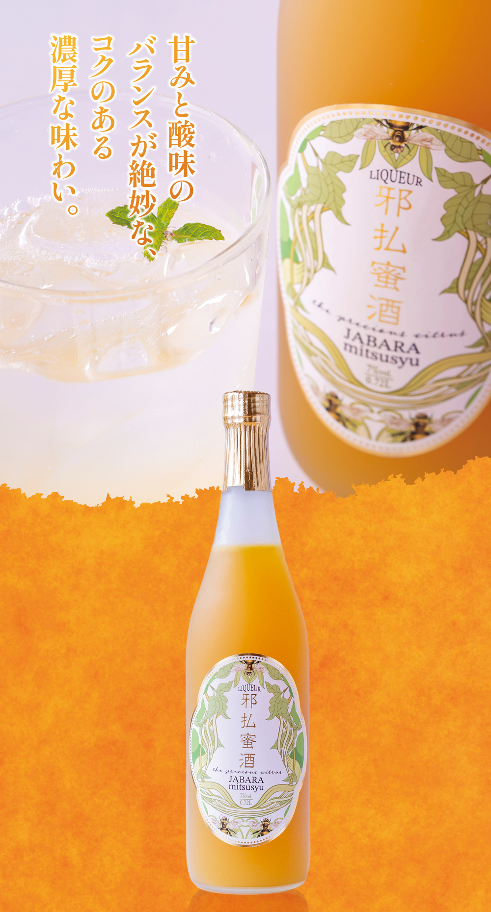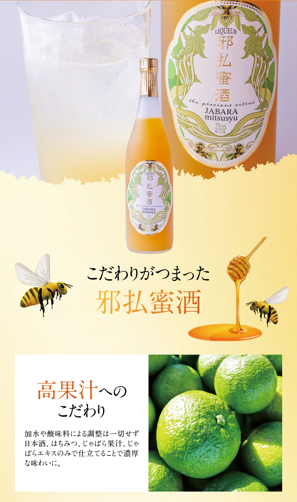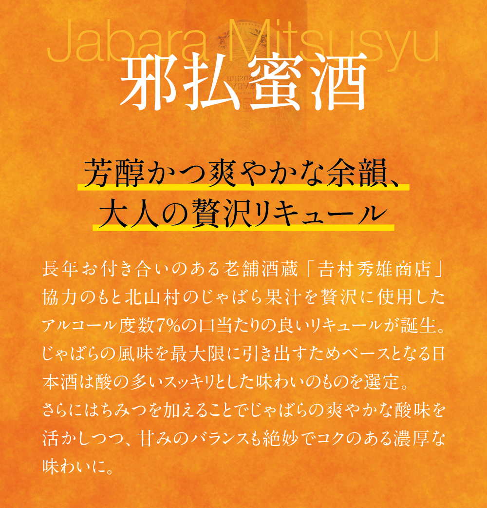 長年お付き合いのある老舗酒蔵「𠮷村秀雄商店」協力のもと 北山村のじゃばら果汁を贅沢に使用したアルコール度数7%の口当たりの良いリキュール。