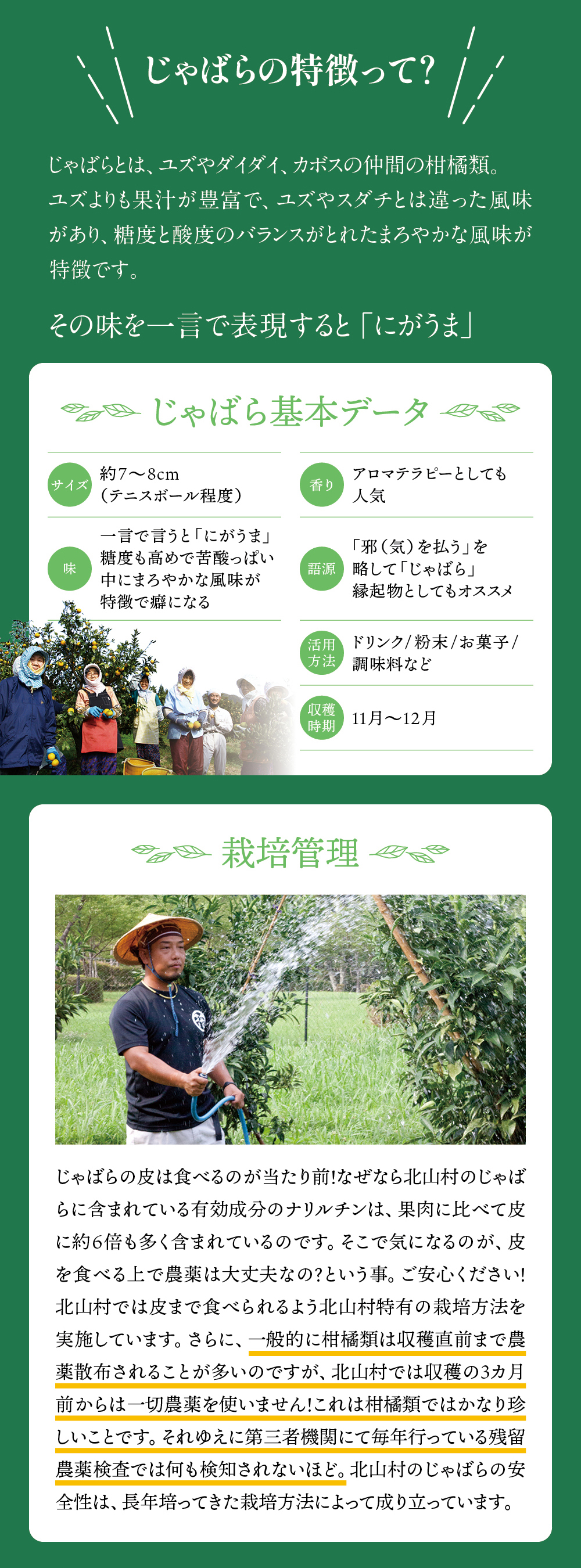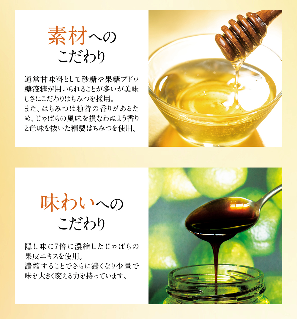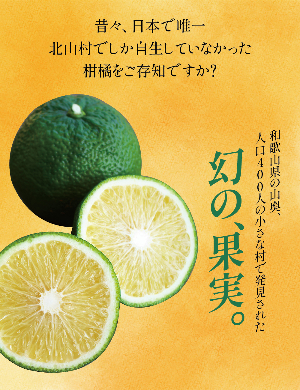 和歌山県の小さな山村「北山村」に、柚子でもない、スダチでもない、とんでもない、へんなみかんが1本だけありました。その名は「じゃばら」。鬼も逃げ出す酸っぱさからか、はたまた松のような不思議な香りがするからか、それは定かではありませんが「邪気を払う」、そんな意味でこう呼ばれていました。たった1本の木から、過疎化の救世主として大事に、大事に育てられ、今ではその数なんと7,000本!じゃばらは、さまざまな加工品となり、山奥の村から皆様のもとへお届けさせていただいています。