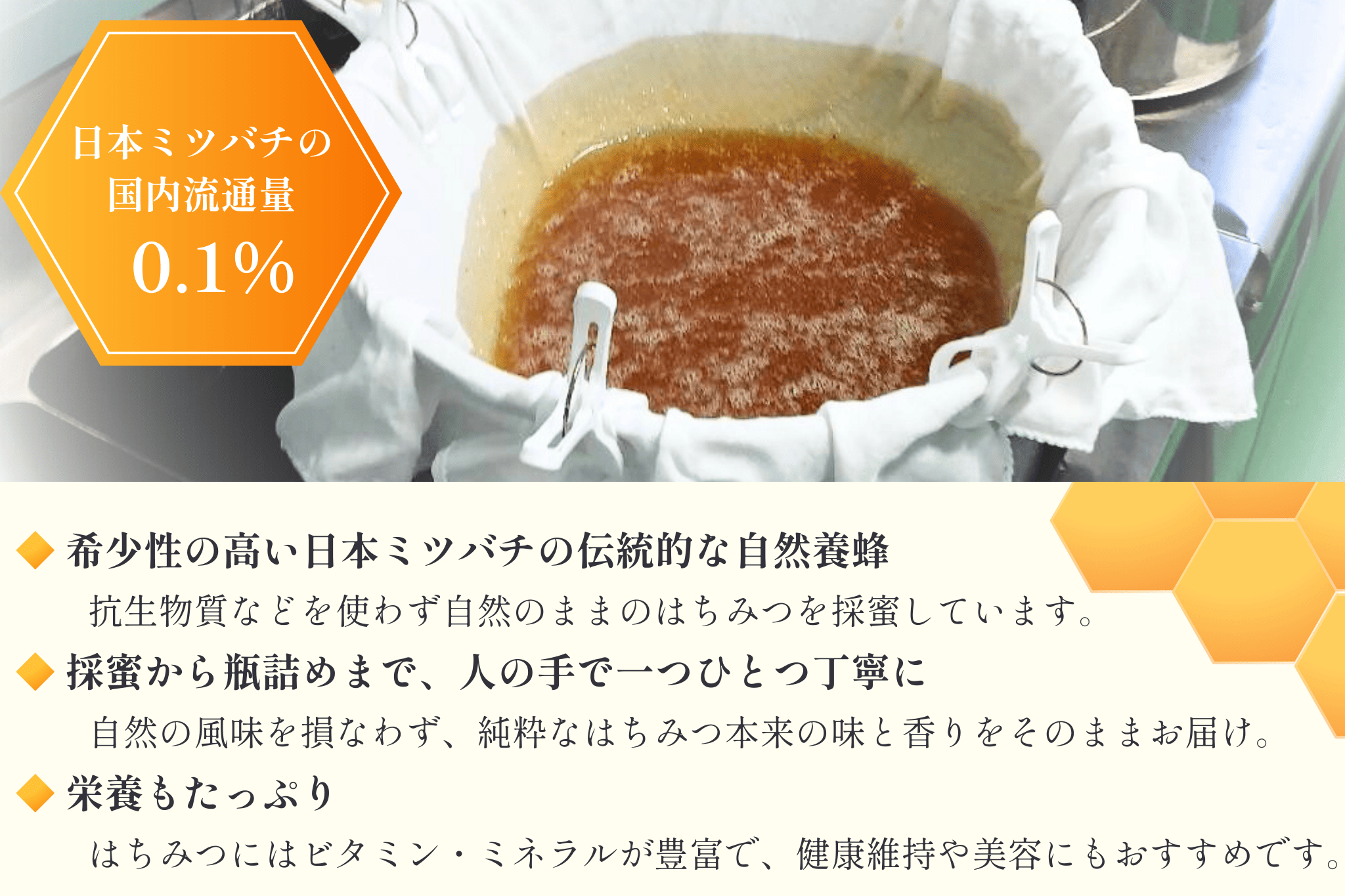 日本ミツバチのはちみつは、国内流通量は0.1%であり、大変希少です。