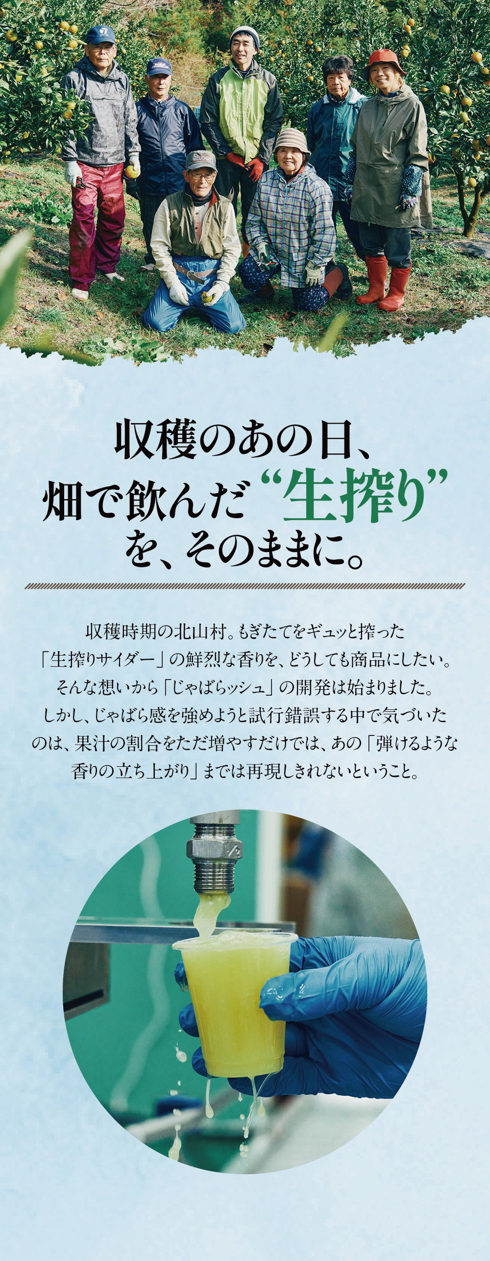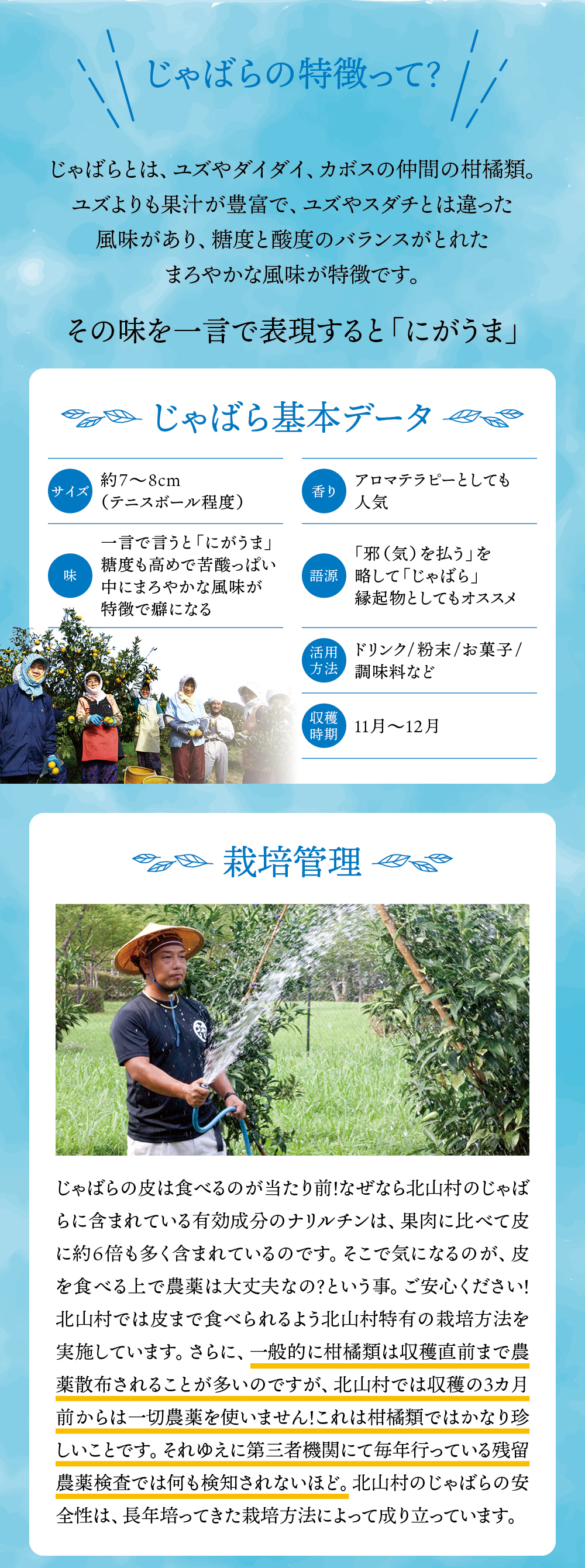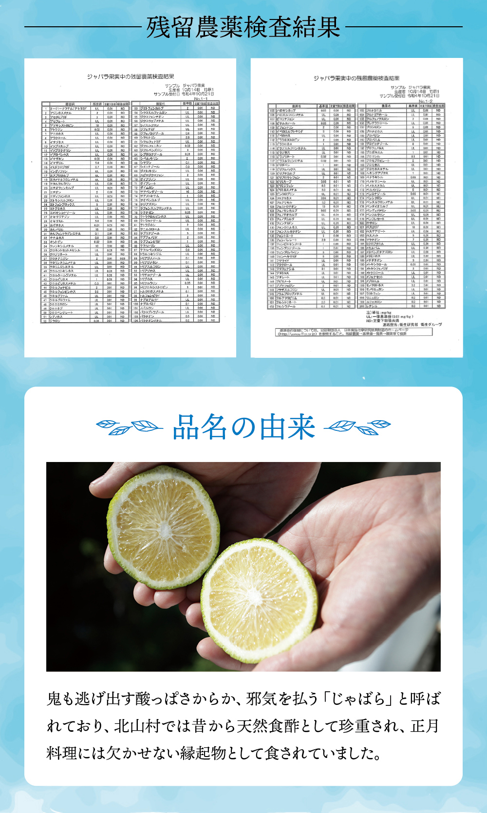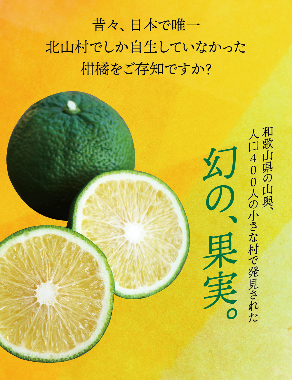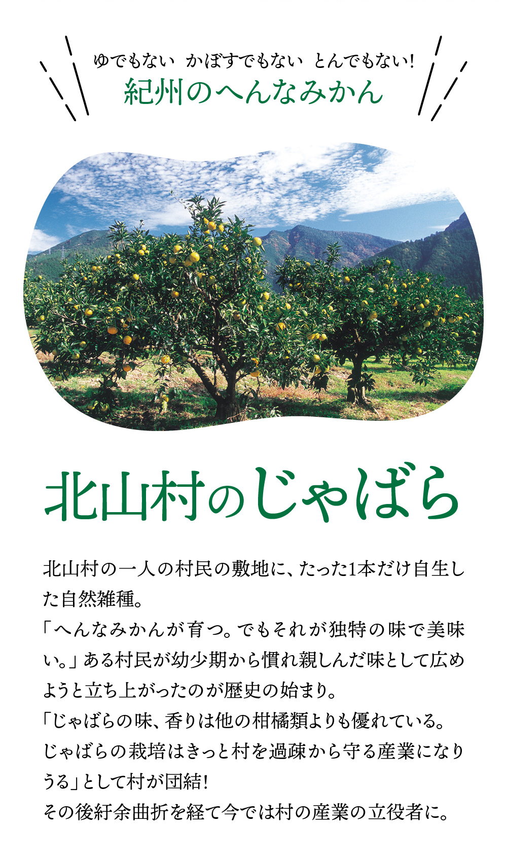 和歌山県の小さな山村「北山村」に、柚子でもない、スダチでもない、とんでもない、へんなみかんが1本だけありました。その名は「じゃばら」。鬼も逃げ出す酸っぱさからか、はたまた松のような不思議な香りがするからか、それは定かではありませんが「邪気を払う」、そんな意味でこう呼ばれていました。たった1本の木から、過疎化の救世主として大事に、大事に育てられ、今ではその数なんと7,000本!じゃばらは、さまざまな加工品となり、山奥の村から皆様のもとへお届けさせていただいています。