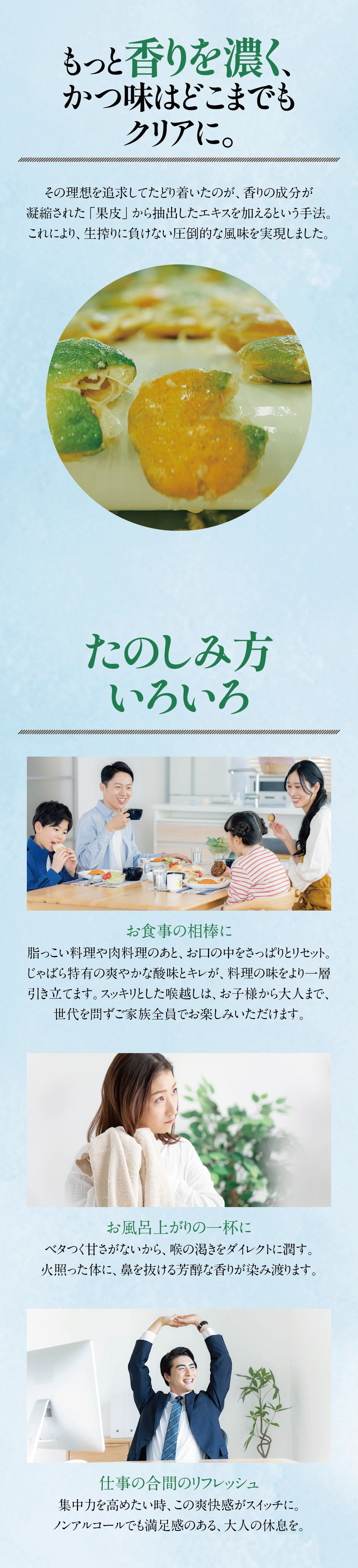 甘さ控えめ、後味すっきりのじゃばらサイダー。じゃばら果汁に加え、独自の「果皮エキス」をブレンド。じゃばら本来の風味を最大限に引き出し、爽やかな香りと、スッキリとした喉越し。