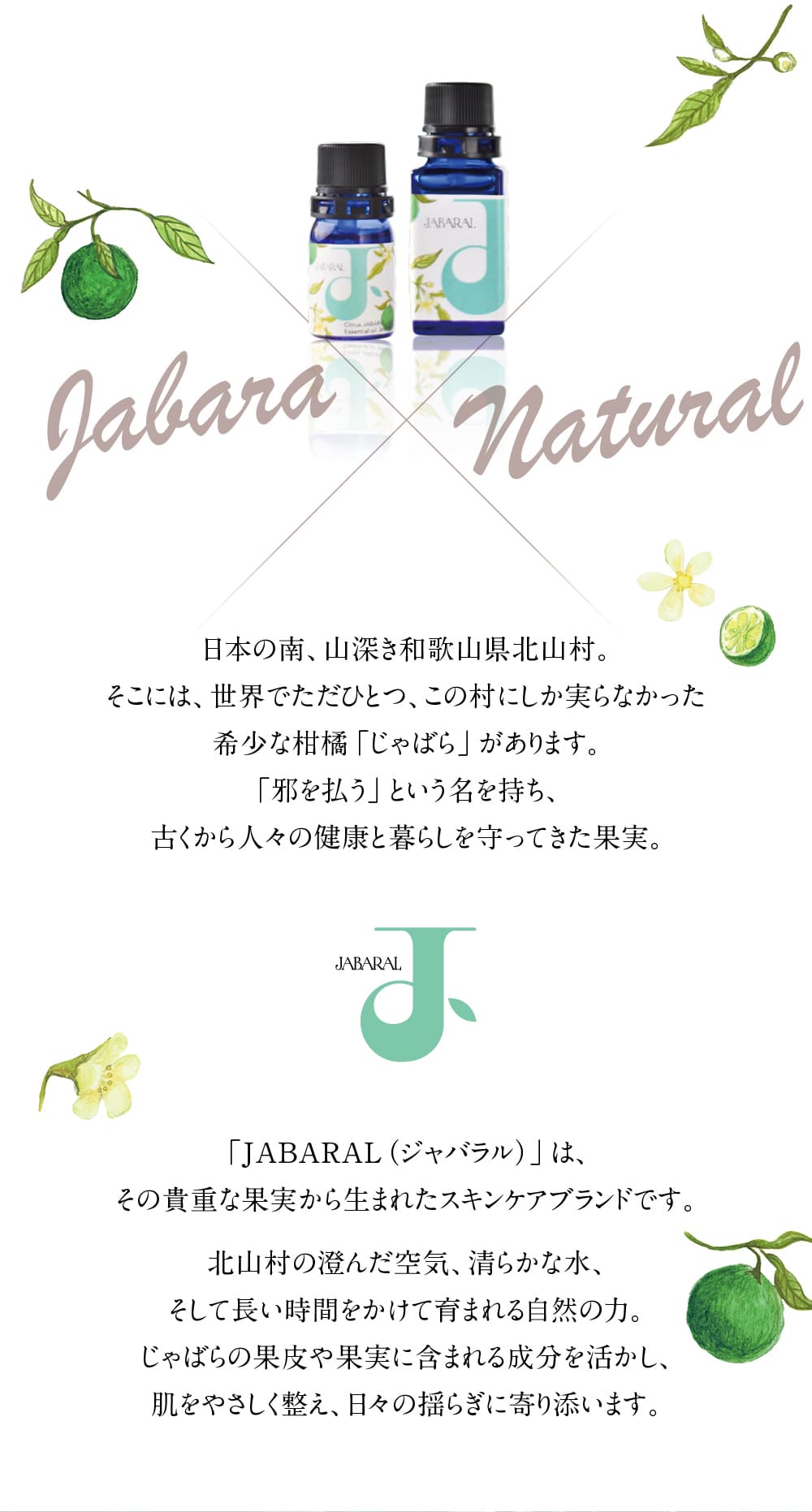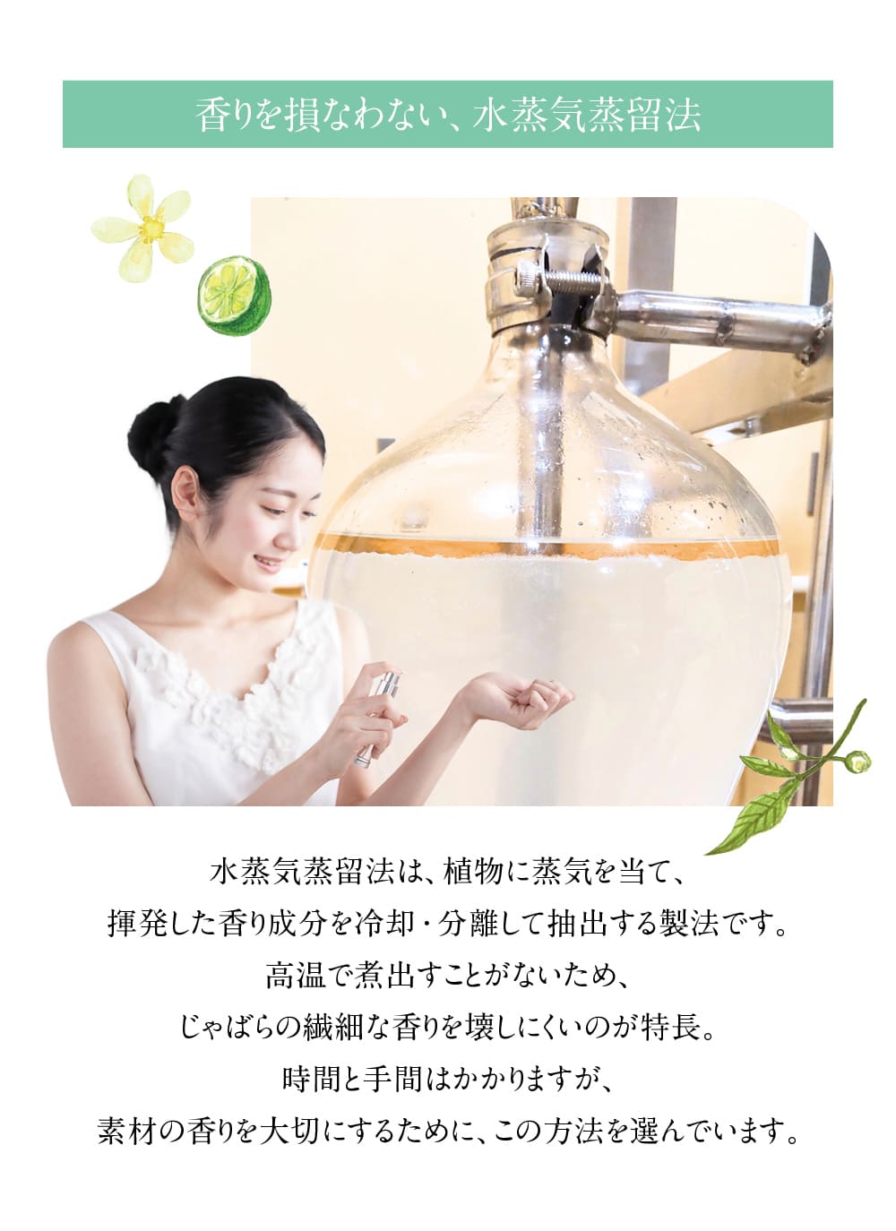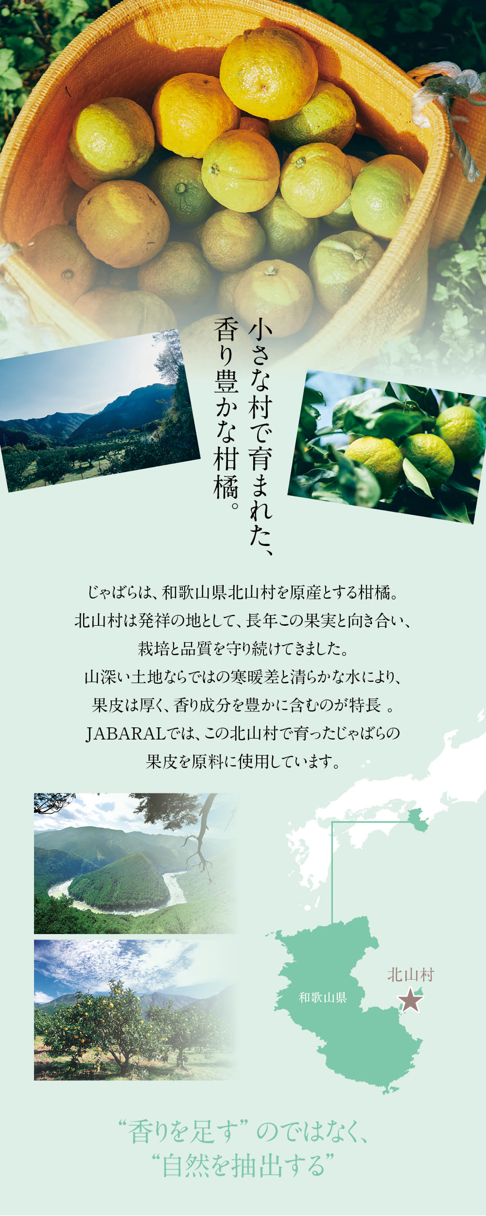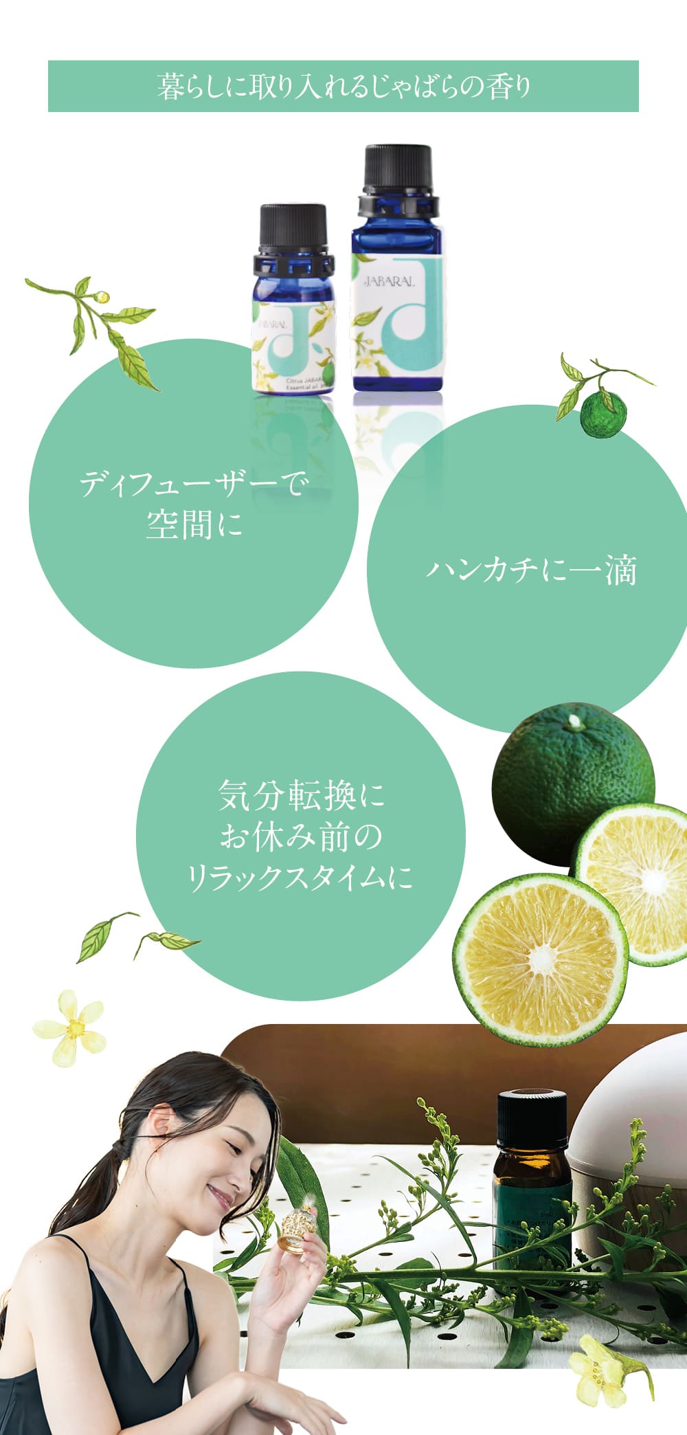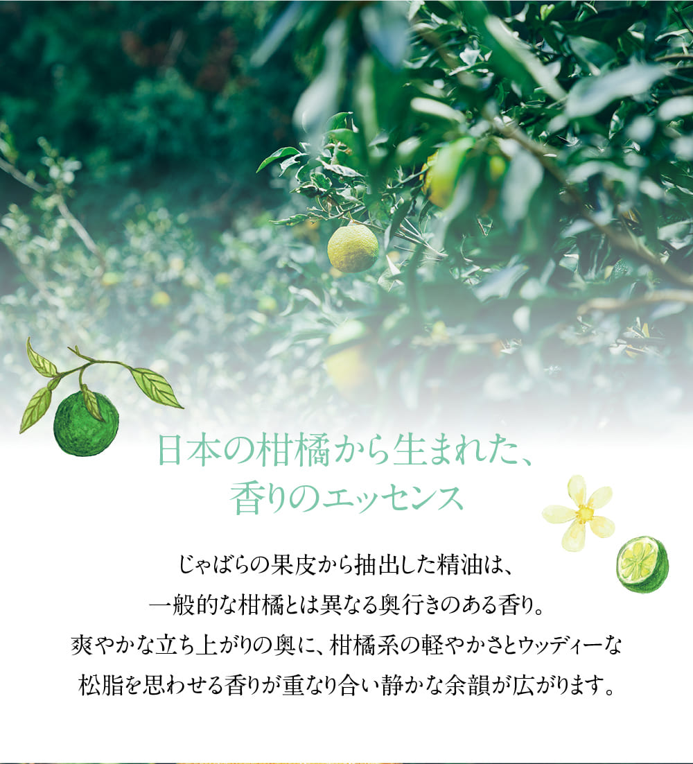 天然和精油。瑞々しく爽やかな「じゃばら」の香り。 果皮を水蒸気蒸留法で抽出した天然精油のみで、 じゃばら本来の香りを楽しむことができます。