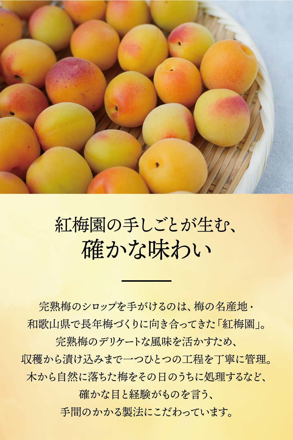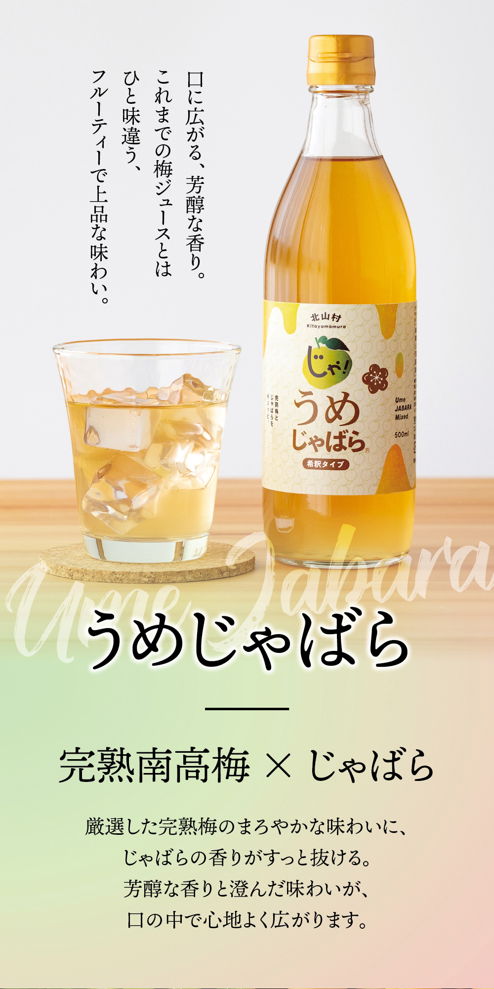 「完熟南高梅×じゃばら」 これまでの梅ジュースとはひと味違う、フルーティーで上品な味わい。厳選した完熟梅のまろやかな味わいに、じゃばらの香りがすっと抜ける。芳醇な香りと澄んだ味わいが、口の中で心地よく広がります。
