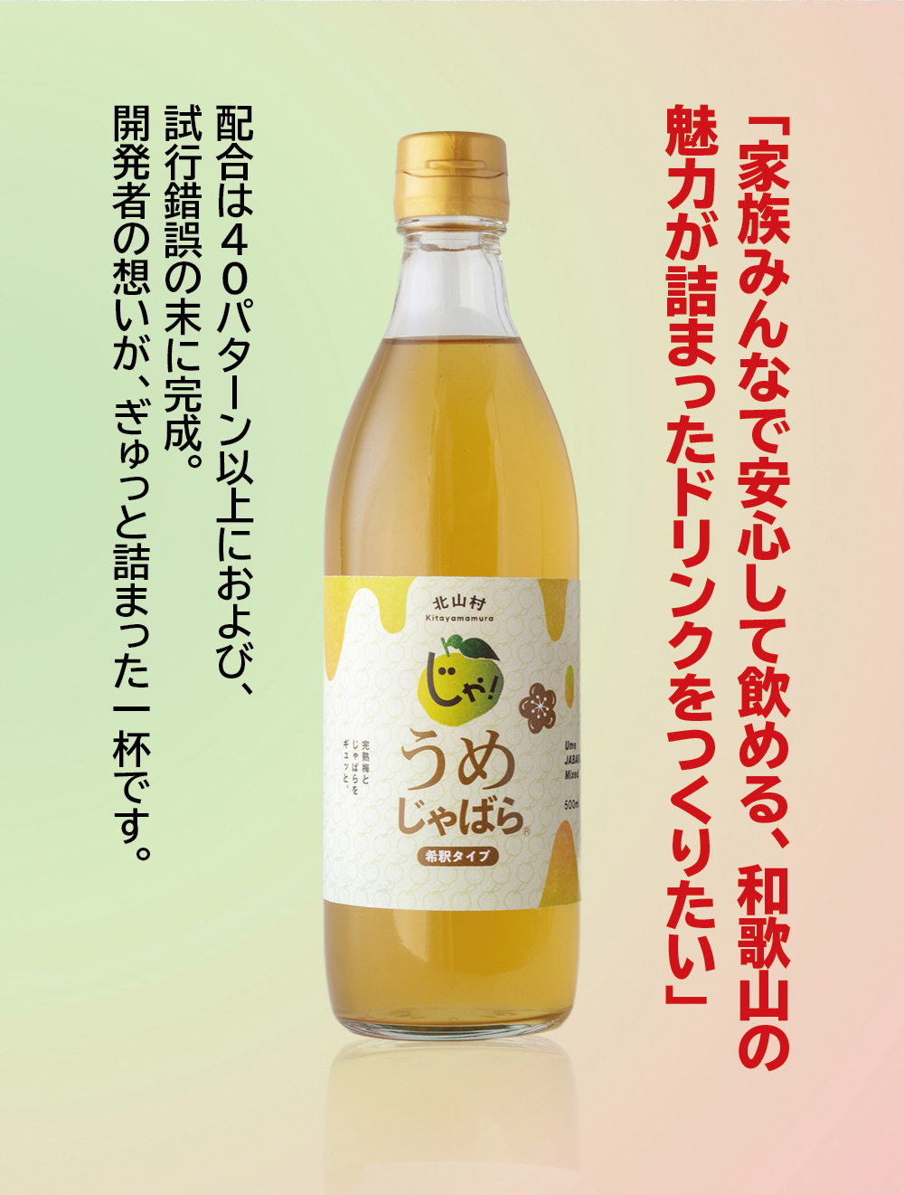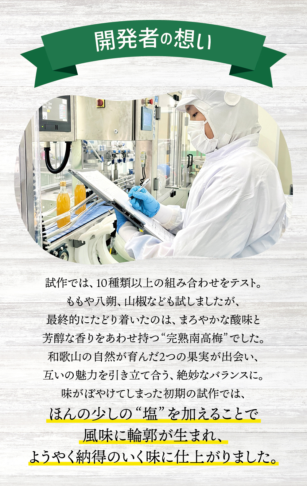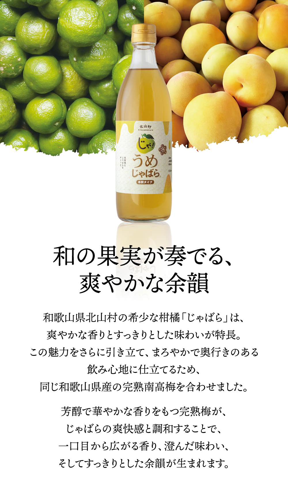 「完熟南高梅×じゃばら」 これまでの梅ジュースとはひと味違う、フルーティーで上品な味わい。厳選した完熟梅のまろやかな味わいに、じゃばらの香りがすっと抜ける。芳醇な香りと澄んだ味わいが、口の中で心地よく広がります。