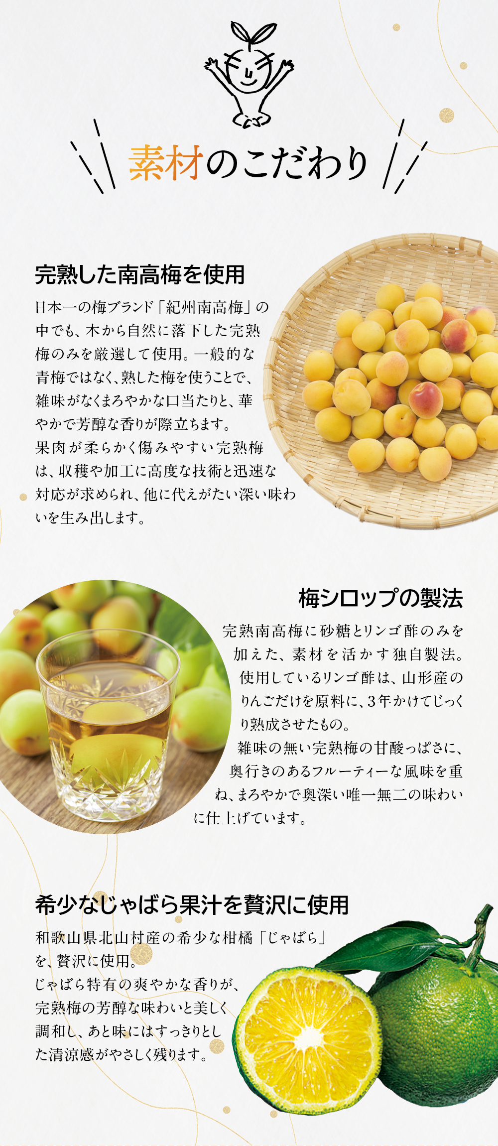 原材料名: 梅シロップ(梅(和歌山県産)、砂糖、リンゴ酢)、砂糖混合ぶどう糖液糖、じゃばら果汁、じゃばら果皮、食塩
