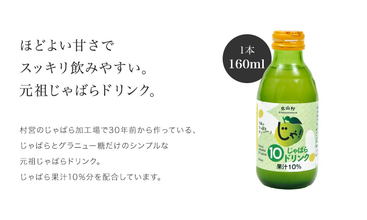 30年以上愛され続けているロングセラー。じゃばらとグラニュー糖だけのシンプルな元祖じゃばらドリンク。 甘すぎず、苦すぎず、程よい酸味と旨味のじゃばら果汁10%のストレートドリンクです。 プレゼントや贈答品のギフトとしても人気です。