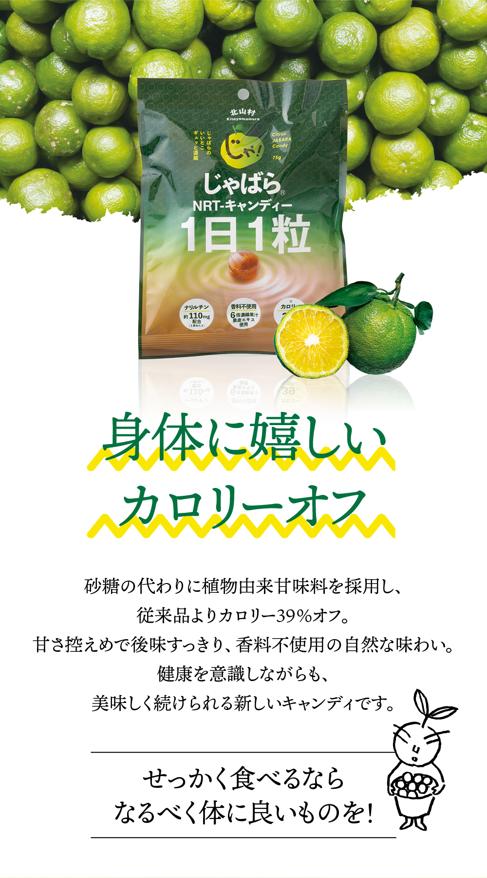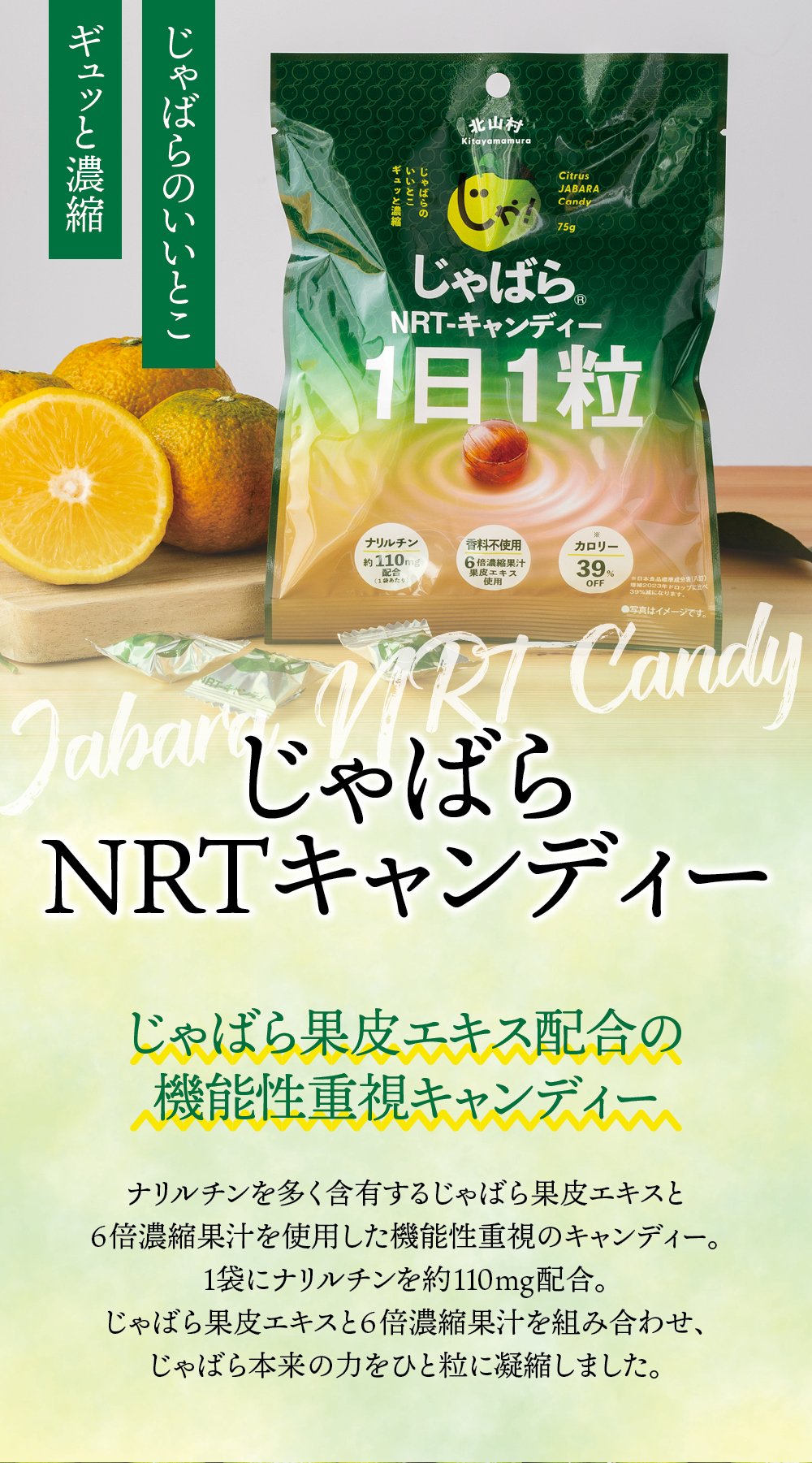 じゃばら果皮エキスと6倍濃縮果汁を使用したキャンディー。 砂糖の代わりに植物由来の低カロリー甘味料を使用しており、じゃばら果汁飴よりもカロリーが39%オフとなっています。 しかも甘さ控えめなので、甘いキャンディーが苦手な方にもおすすめです。 1粒あたり果汁13ml相当の、約5.7mgのナリルチンが含有されています。