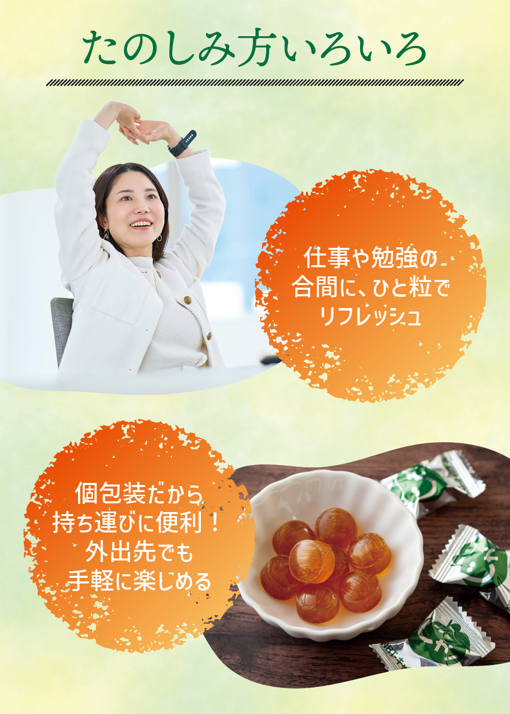 いつもお世話になっております。 じゃばらの錠剤もよいのですが、出先の場合、飴のほうが利用しやすくお手軽なので併用しています。効果もかなりあると思います。