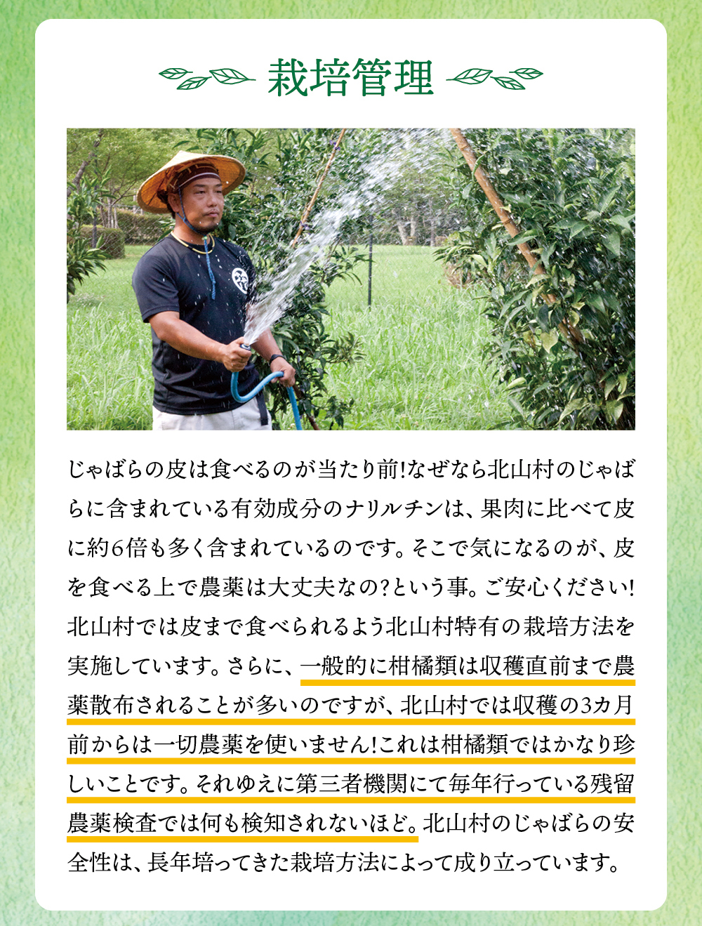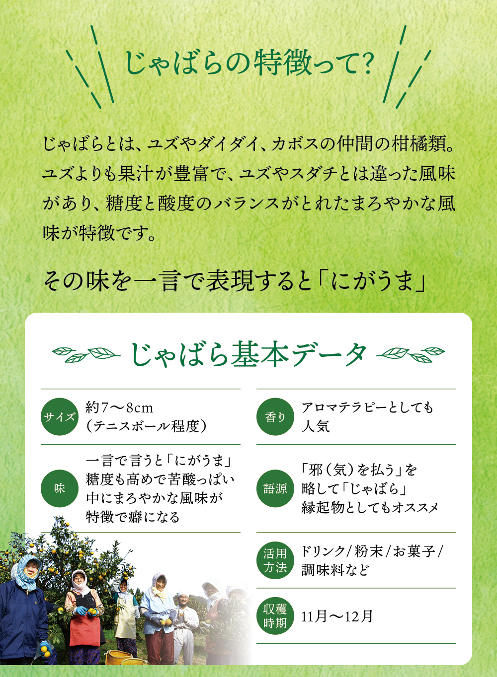 和歌山県の小さな山村「北山村」に、柚子でもない、スダチでもない、とんでもない、へんなみかんが1本だけありました。その名は「じゃばら」。鬼も逃げ出す酸っぱさからか、はたまた松のような不思議な香りがするからか、それは定かではありませんが「邪気を払う」、そんな意味でこう呼ばれていました。たった1本の木から、過疎化の救世主として大事に、大事に育てられ、今ではその数なんと7,000本!じゃばらは、さまざまな加工品となり、山奥の村から皆様のもとへお届けさせていただいています。