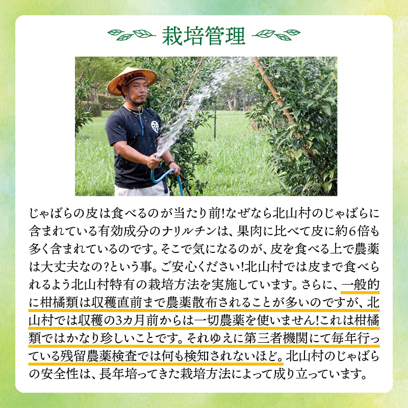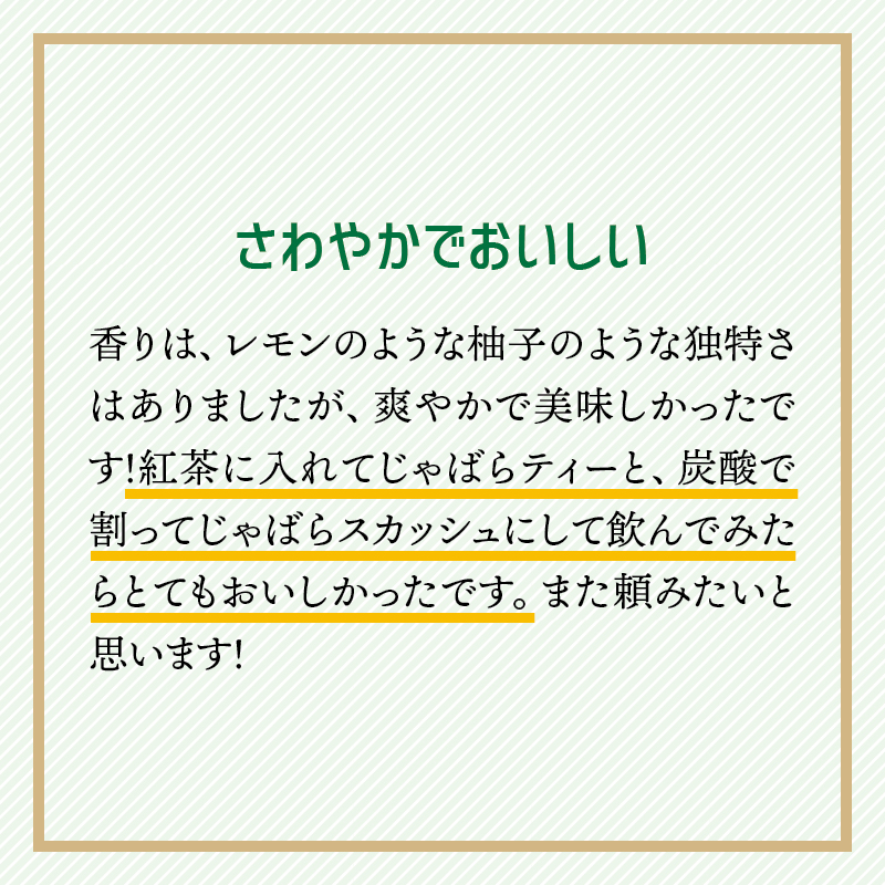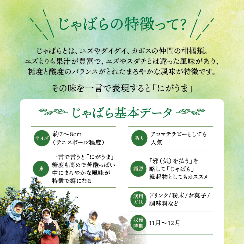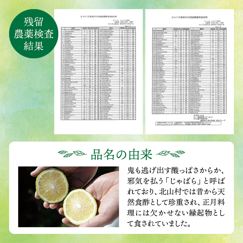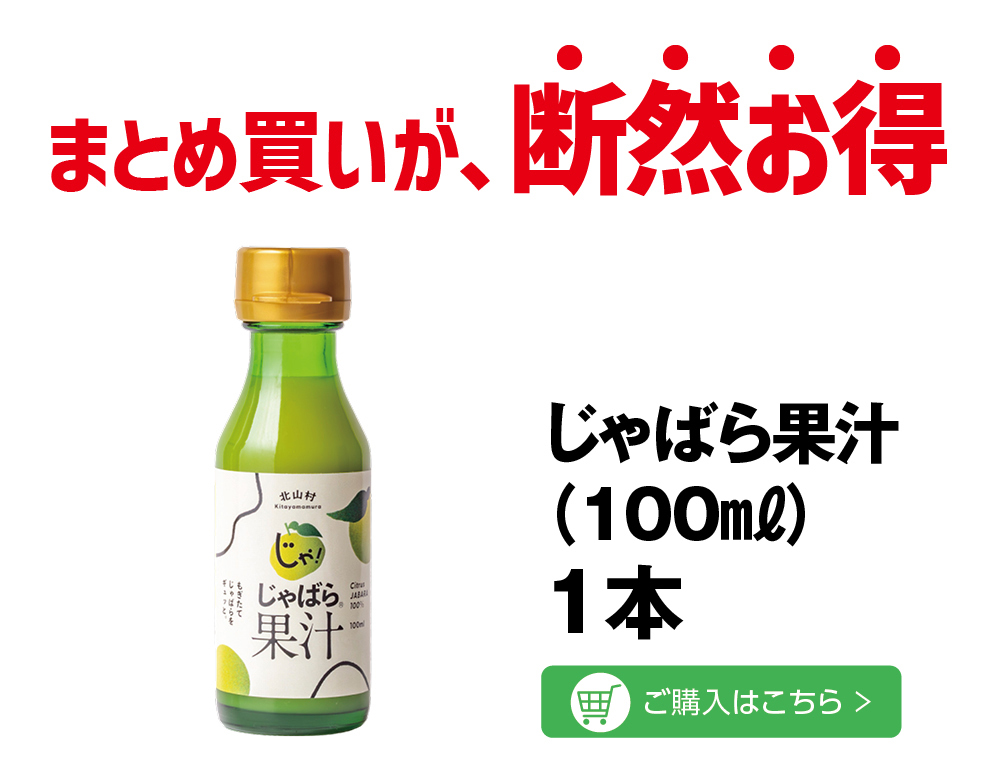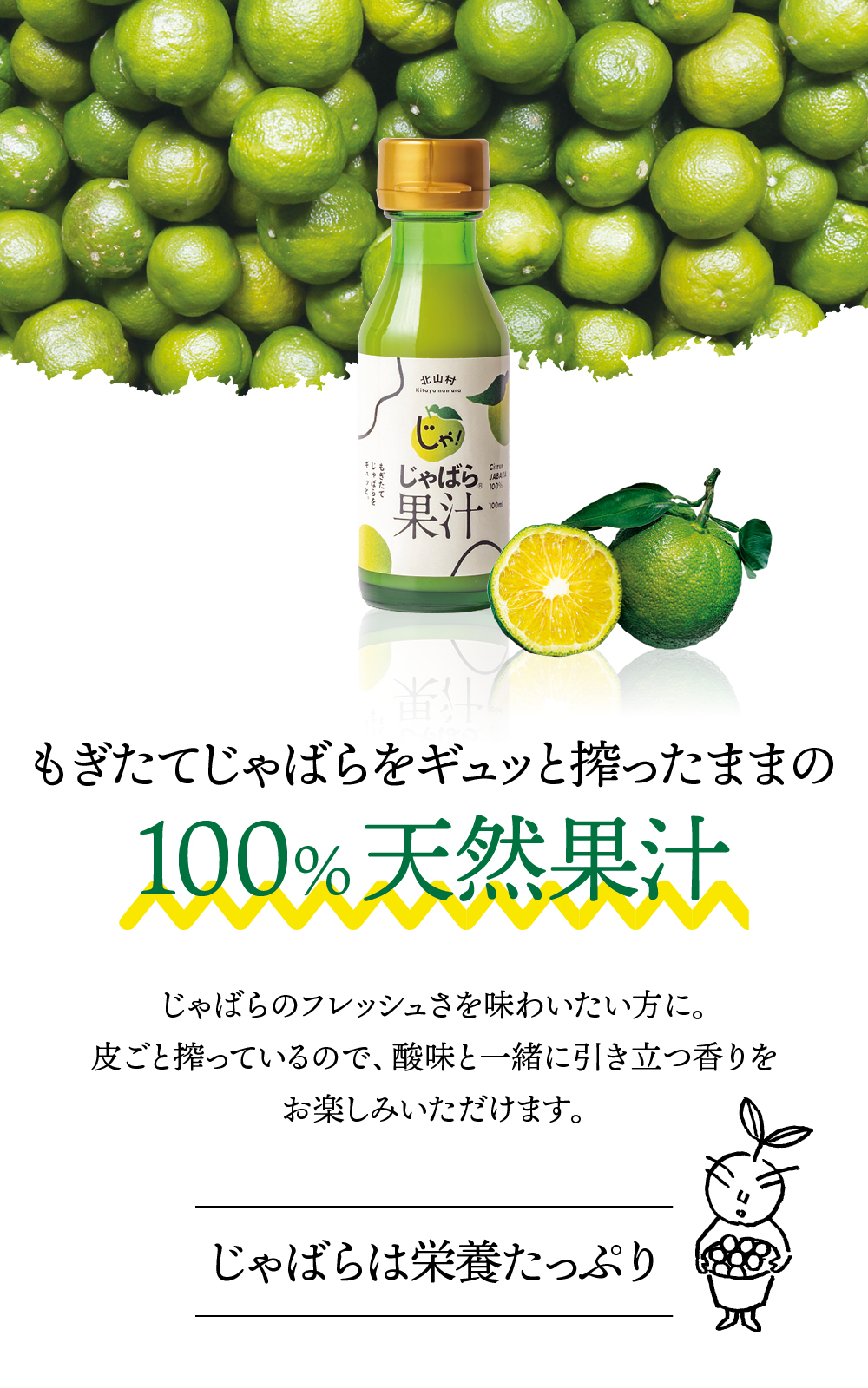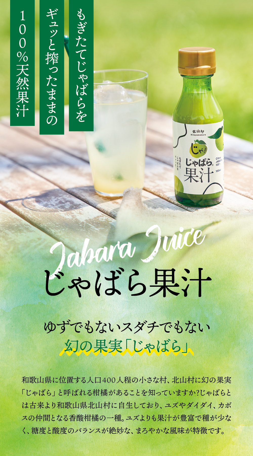 和歌山県の小さな山村「北山村」に、柚子でもない、スダチでもない、とんでもない、へんなみかんが1本だけありました。その名は「じゃばら」。鬼も逃げ出す酸っぱさからか、はたまた松のような不思議な香りがするからか、それは定かではありませんが「邪気を払う」、そんな意味でこう呼ばれていました。たった1本の木から、過疎化の救世主として大事に、大事に育てられ、今ではその数なんと7,000本!じゃばらは、さまざまな加工品となり、山奥の村から皆様のもとへお届けさせていただいています。