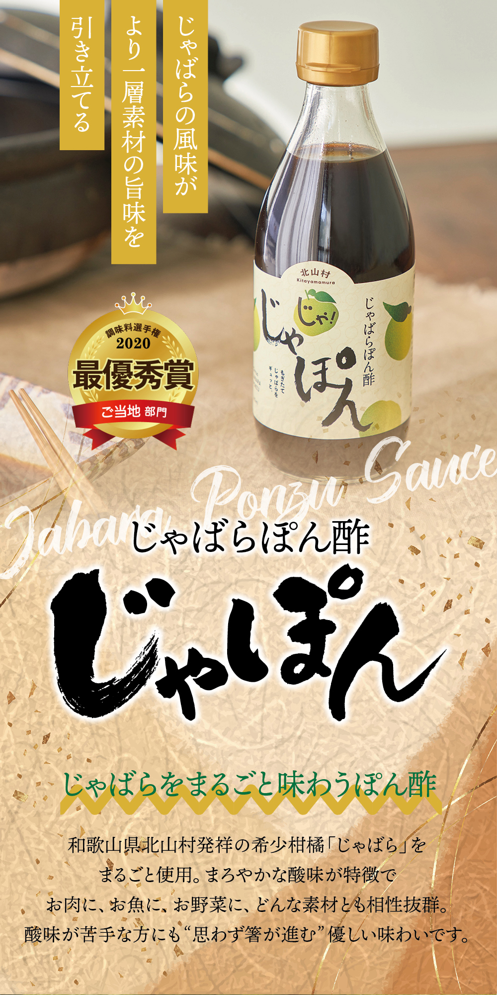 調味料選手権2020のご当地部門で「最優秀賞」を受賞。 じゃばらの皮までまるごと使ったぽん酢。 じゃばらの風味が素材の旨味を引き立てて、だしエキス不使用なのに不思議とコクうま。