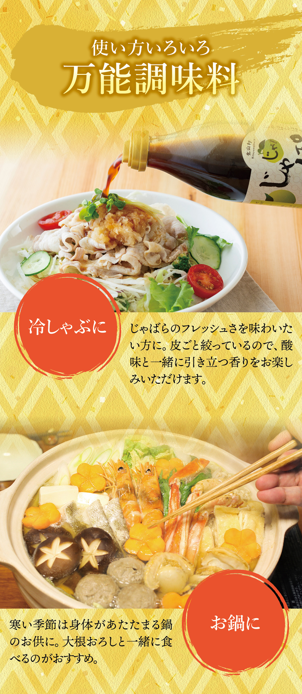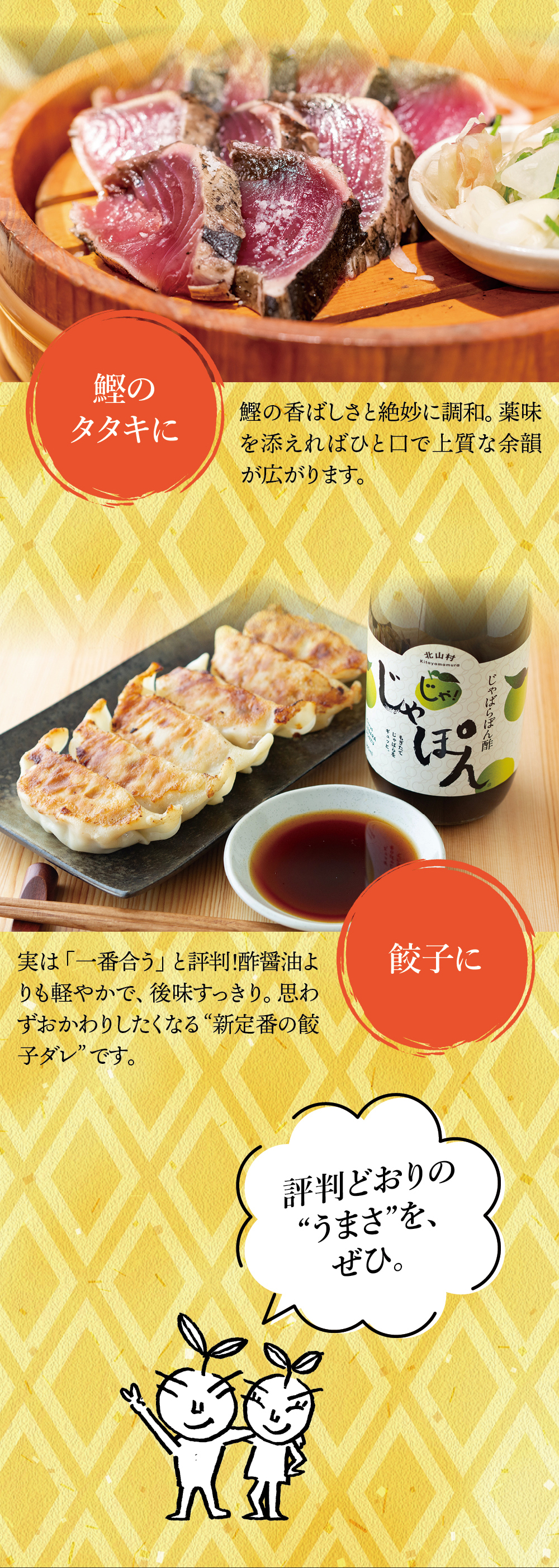 他社のポン酢ではおひたしやサラダなどに使っていました。このじゃぽんはお酢の酸っぱさが強めながらもじゃばらがマイルドな風味を出していて、ポン酢好きとしてはまあまあかなと思っていました。が、餃子にたまたま使ってみたらものすごく美味しく、肉にとても合うと感じました。もう酢醤油では食べられません。一人で使っているので再注文までに時間はかかりそうですが、必ずリピートします。夏の冷しゃぶにも使うのが楽しみです。
