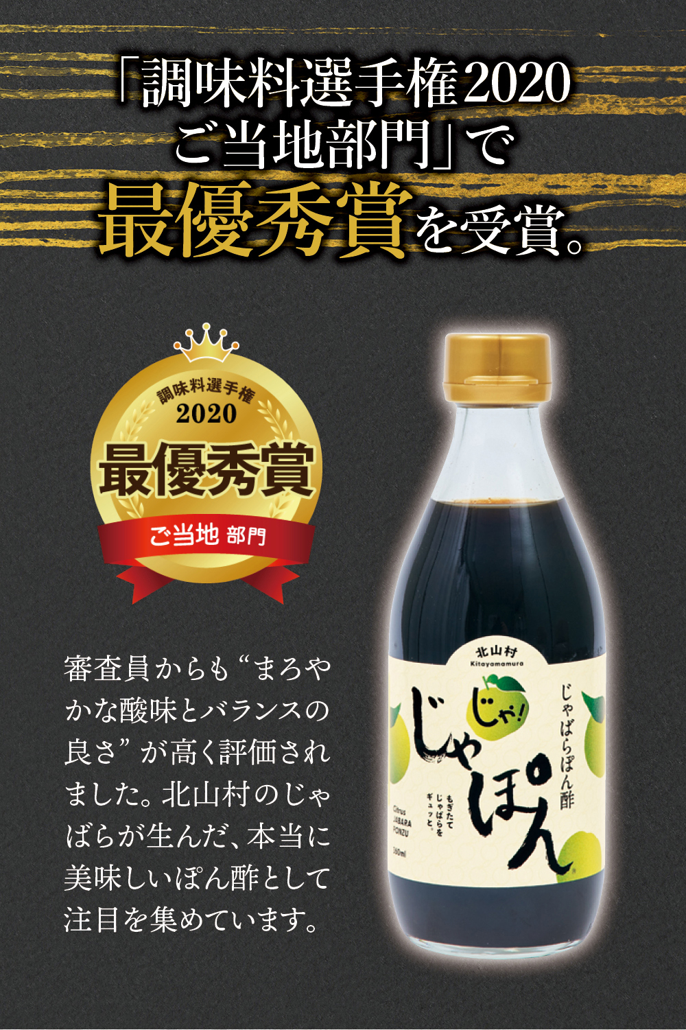 調味料選手権2020のご当地部門で「最優秀賞」を受賞。 じゃばらの皮までまるごと使ったぽん酢。 じゃばらの風味が素材の旨味を引き立てて、だしエキス不使用なのに不思議とコクうま。