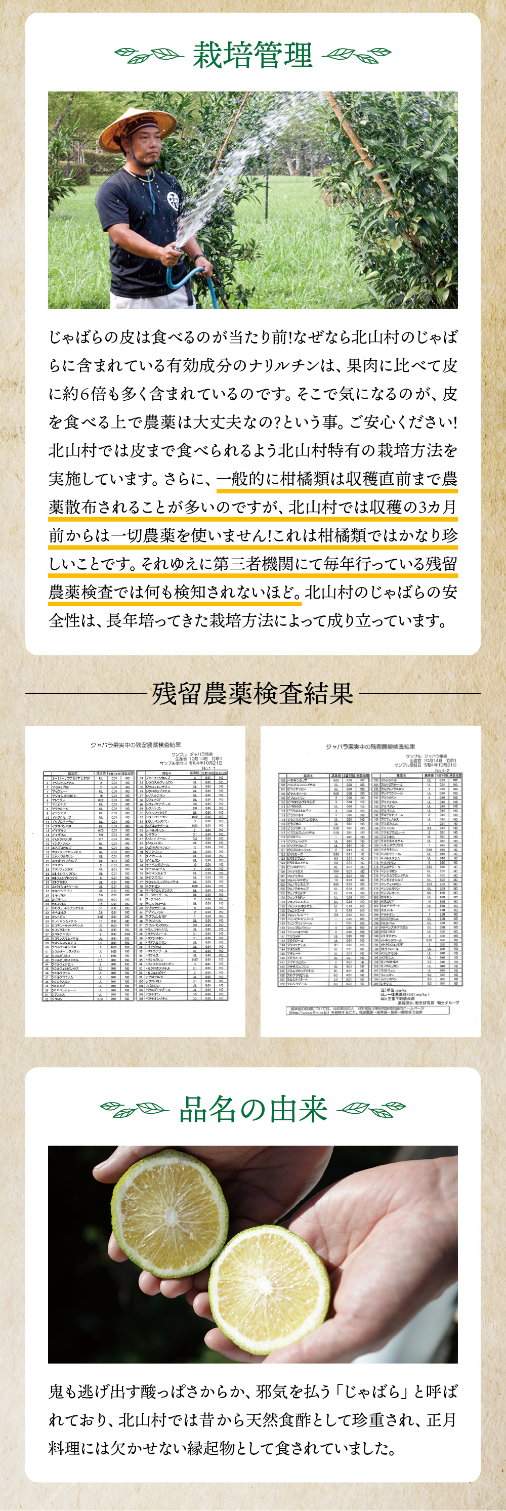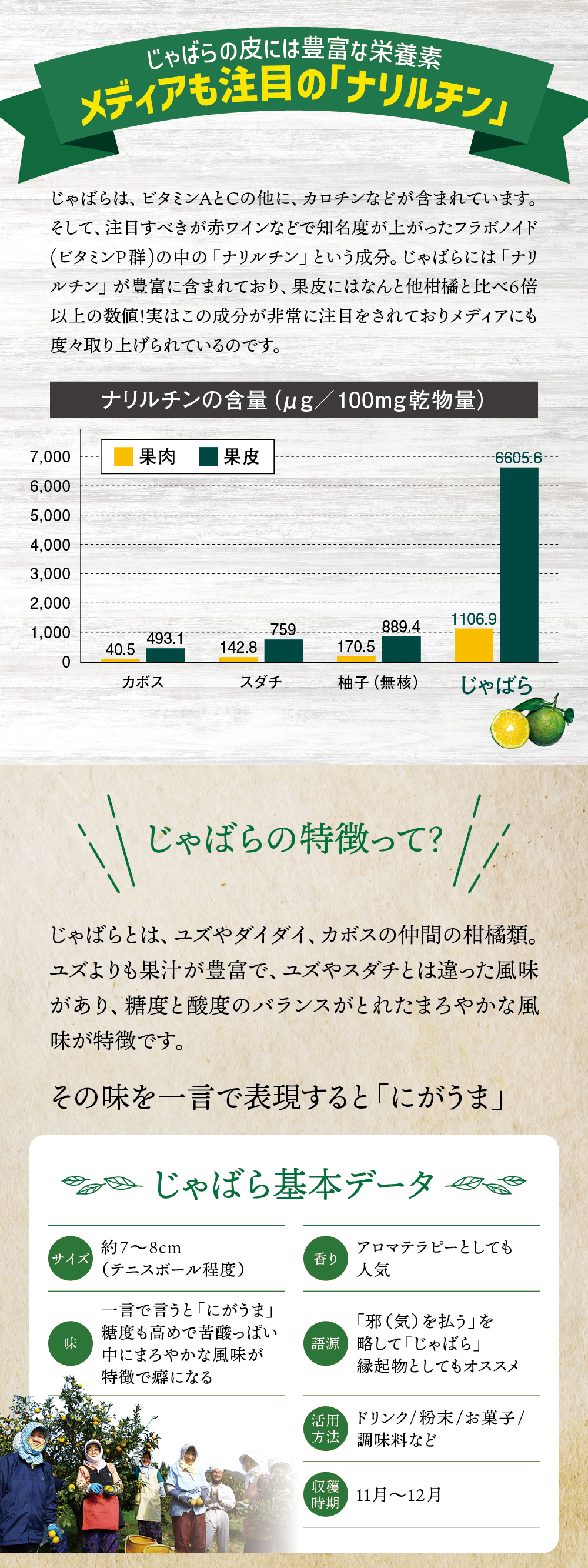 和歌山県の小さな山村「北山村」に、柚子でもない、スダチでもない、とんでもない、へんなみかんが1本だけありました。その名は「じゃばら」。鬼も逃げ出す酸っぱさからか、はたまた松のような不思議な香りがするからか、それは定かではありませんが「邪気を払う」、そんな意味でこう呼ばれていました。たった1本の木から、過疎化の救世主として大事に、大事に育てられ、今ではその数なんと7,000本!じゃばらは、さまざまな加工品となり、山奥の村から皆様のもとへお届けさせていただいています。