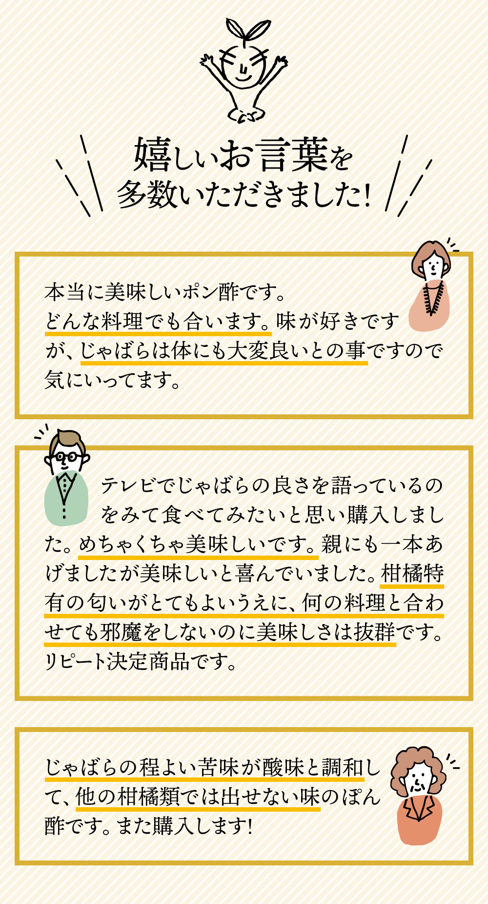友人から頂いたじゃばらポン酢がとてもまろやかで美味しかったので、ネット検索して購入しました。 元々は嫁さんが柚子が苦手だったので市販のポン酢は味ポンでした。 しかしじゃばらポン酢を試して食べてみるとなんと美味しいことか! 私は柚子ポンも好きですがじゃばらポン酢は本当にまろやか!もう他のポン酢では食べれません。 はいリピート間違い無し。3本購入したのですぐには無くなりませんがもう一本は無くなりかけです。笑