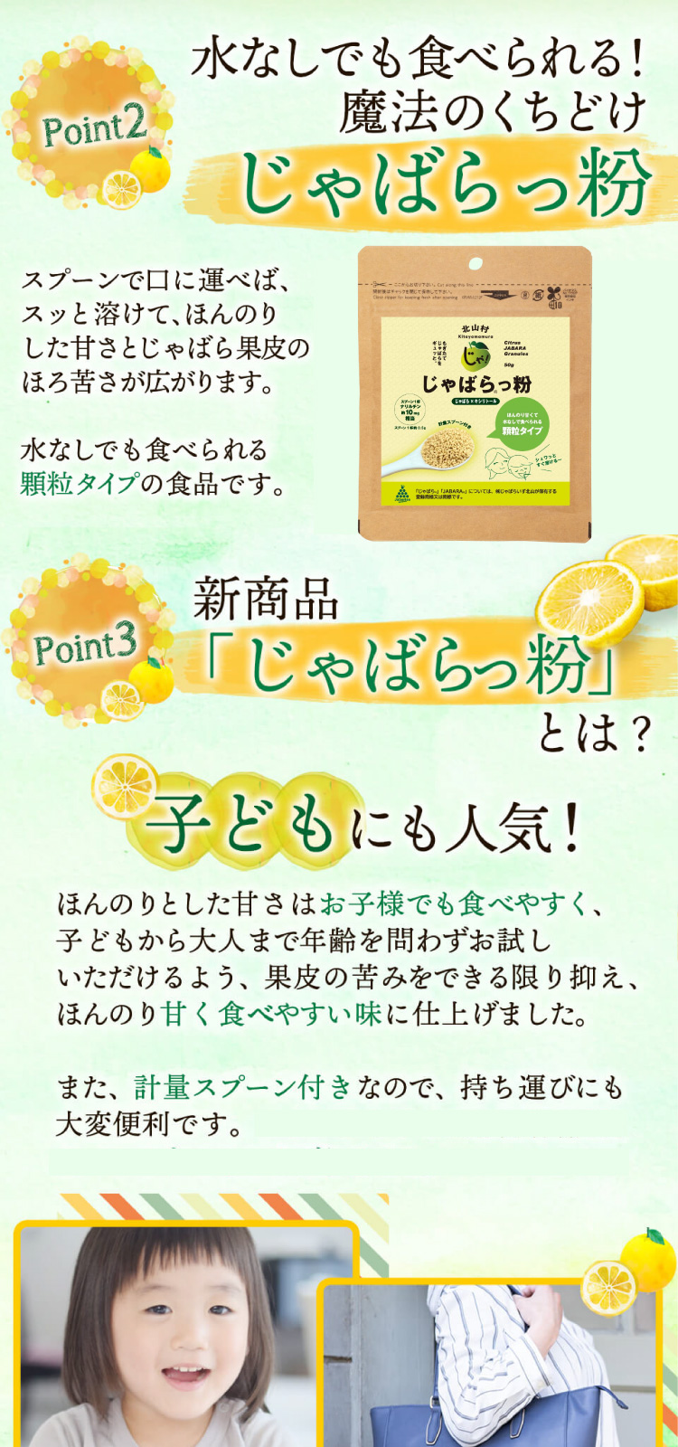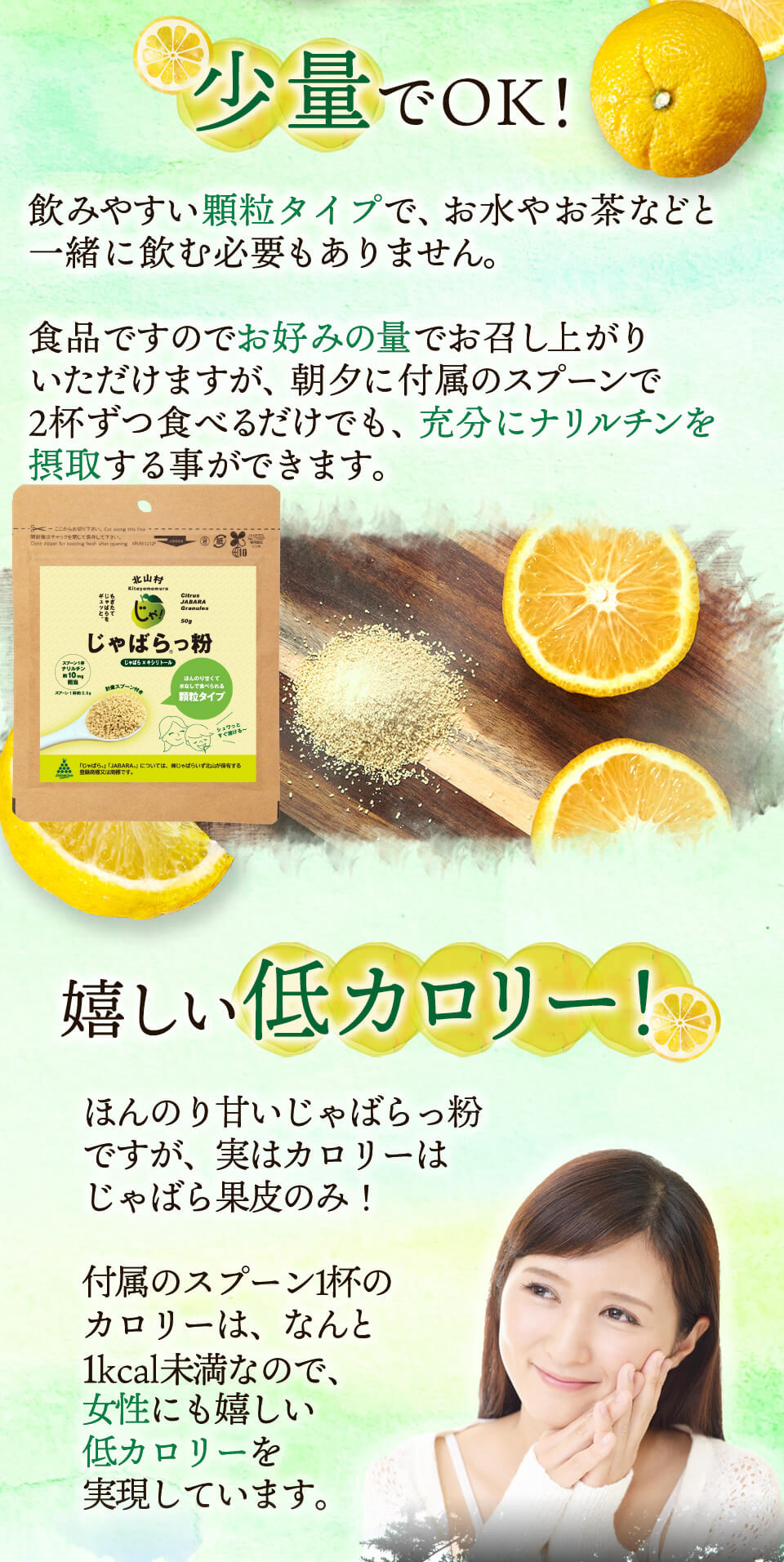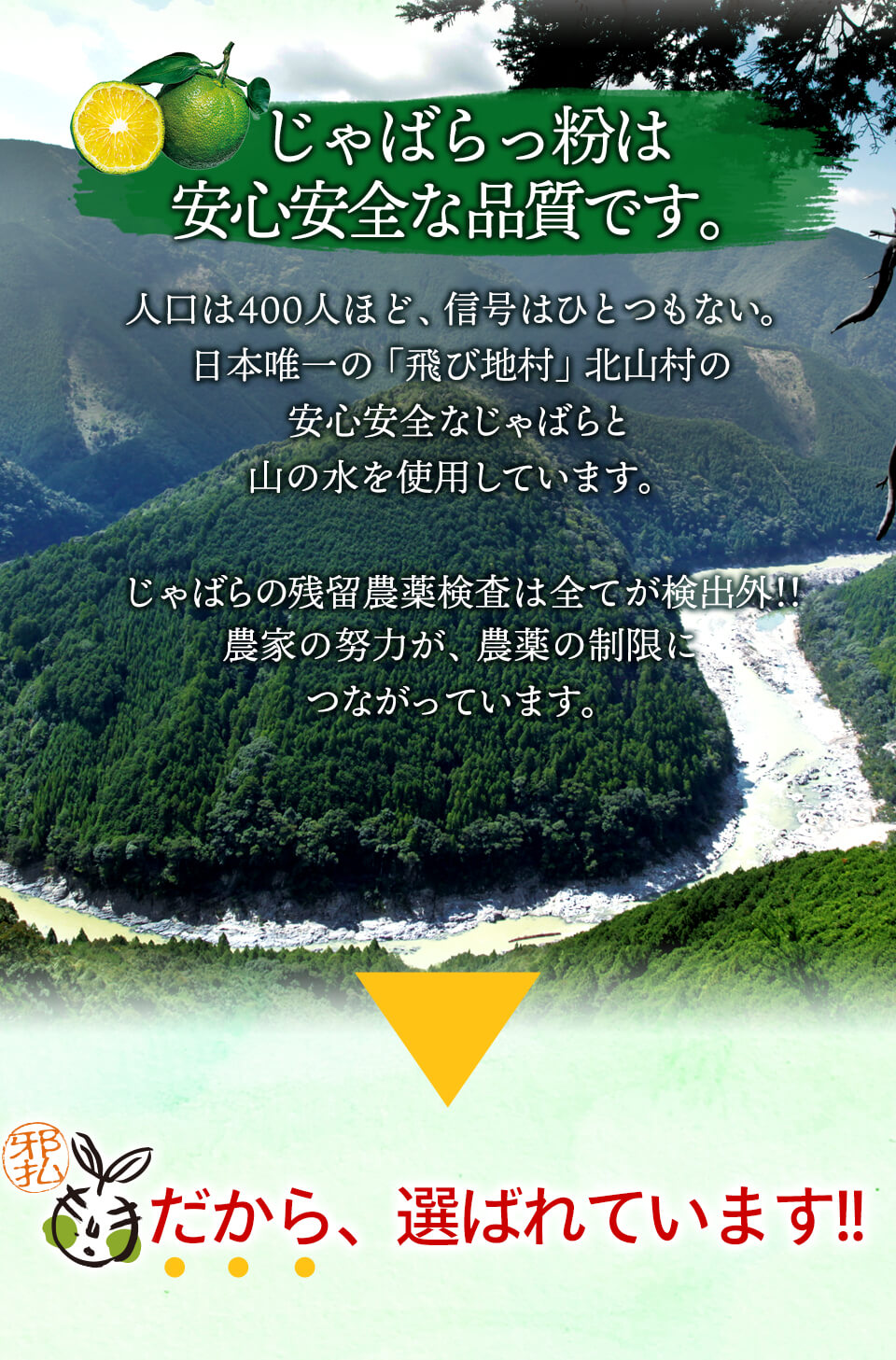 和歌山県の小さな山村「北山村」に、柚子でもない、スダチでもない、とんでもない、へんなみかんが1本だけありました。その名は「じゃばら」。鬼も逃げ出す酸っぱさからか、はたまた松のような不思議な香りがするからか、それは定かではありませんが「邪気を払う」、そんな意味でこう呼ばれていました。たった1本の木から、過疎化の救世主として大事に、大事に育てられ、今ではその数なんと7,000本!じゃばらは、さまざまな加工品となり、山奥の村から皆様のもとへお届けさせていただいています。
