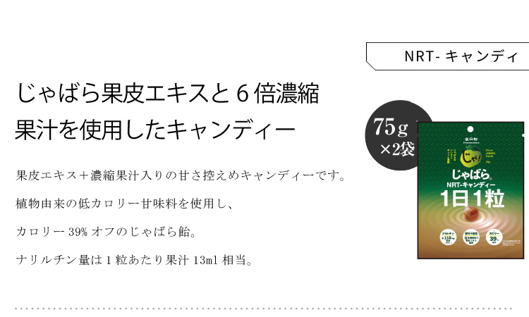 じゃばら果皮エキスと6倍濃縮果汁を使用したキャンディー。 砂糖の代わりに植物由来の低カロリー甘味料を使用しており、じゃばら果汁飴よりもカロリーが39%オフとなっています。 しかも甘さ控えめなので、甘いキャンディーが苦手な方にもおすすめです。 1粒あたり果汁13ml相当の、約5.7mgのナリルチンが含有されています。