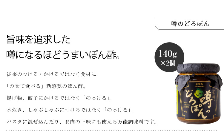 調味料選手権2020のご当地部門で「最優秀賞」を受賞。 じゃばらの皮までまるごと使ったぽん酢「じゃぽん」と噂になるほどうまい新感覚ぽん酢「噂のどろぽん」のセット。