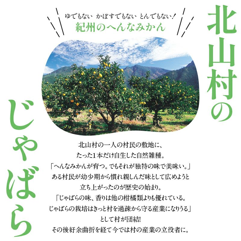和歌山県の小さな山村「北山村」に、柚子でもない、スダチでもない、とんでもない、へんなみかんが1本だけありました。その名は「じゃばら」。鬼も逃げ出す酸っぱさからか、はたまた松のような不思議な香りがするからか、それは定かではありませんが「邪気を払う」、そんな意味でこう呼ばれていました。たった1本の木から、過疎化の救世主として大事に、大事に育てられ、今ではその数なんと7,000本!じゃばらは、さまざまな加工品となり、山奥の村から皆様のもとへお届けさせていただいています。