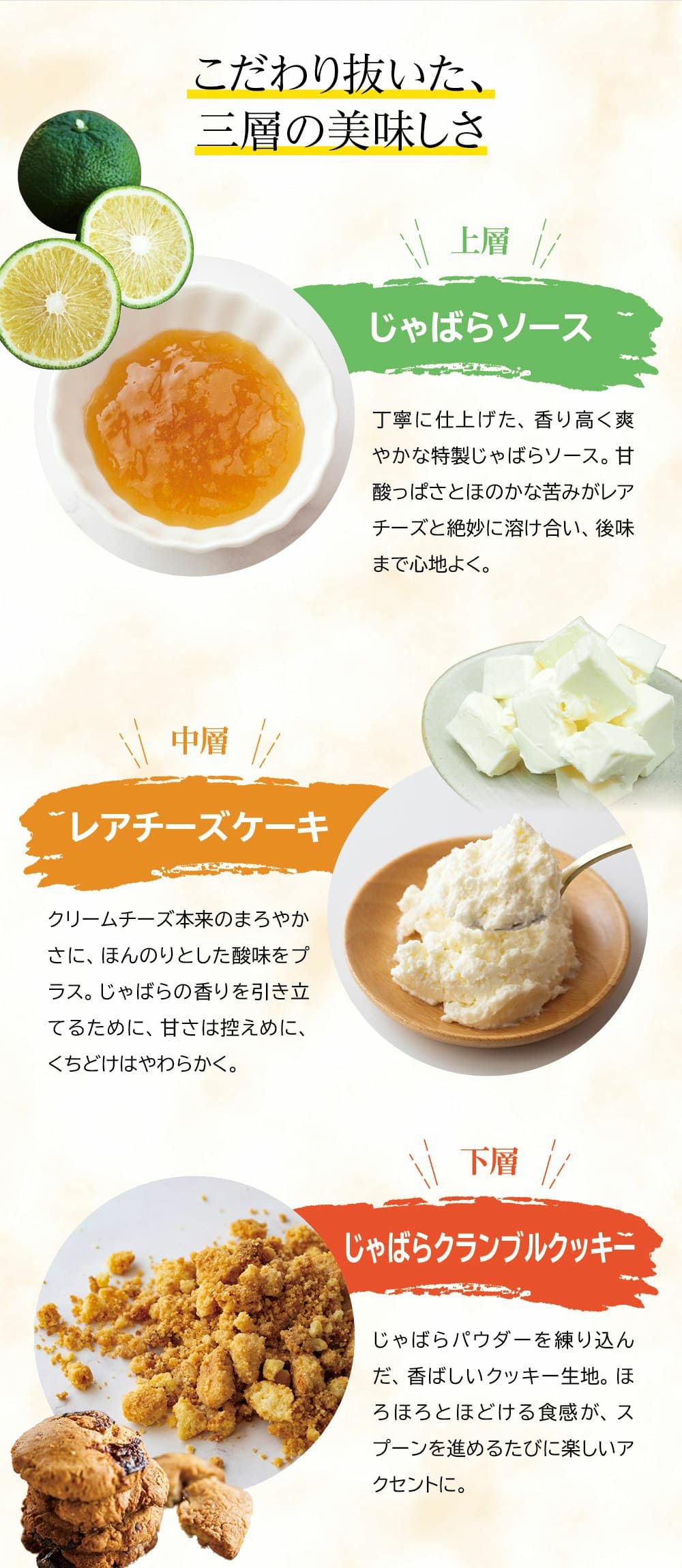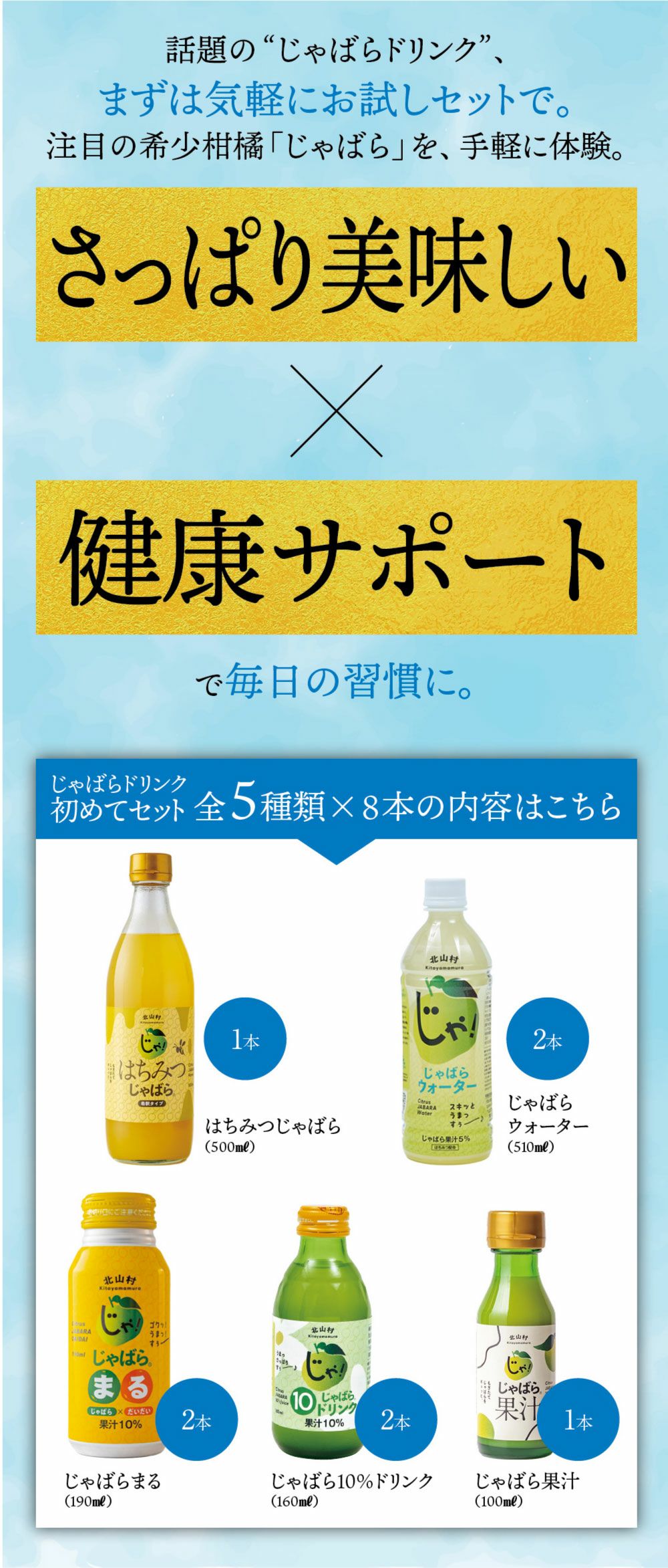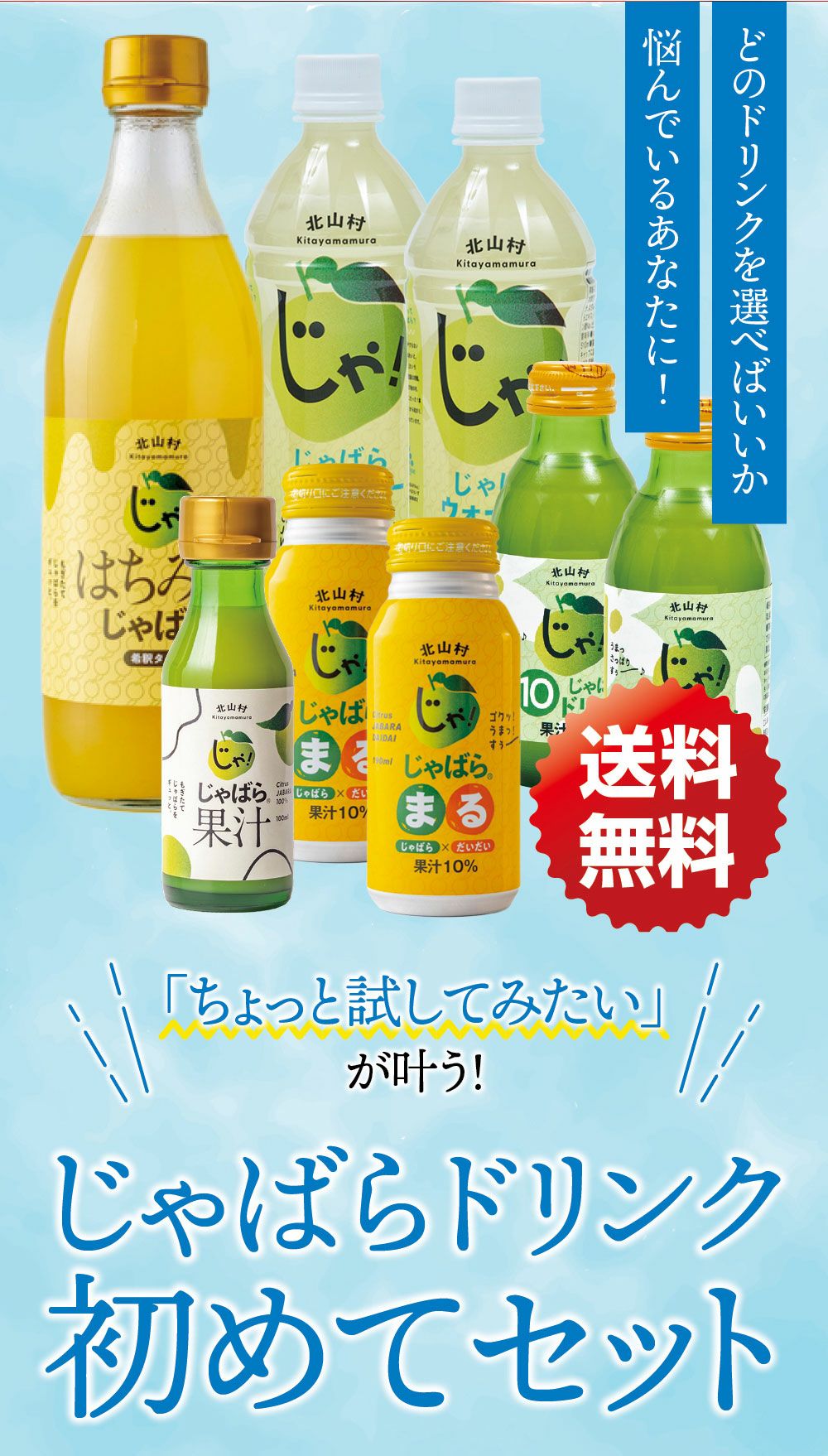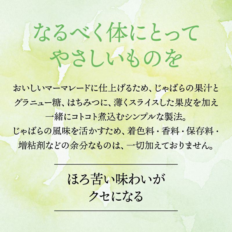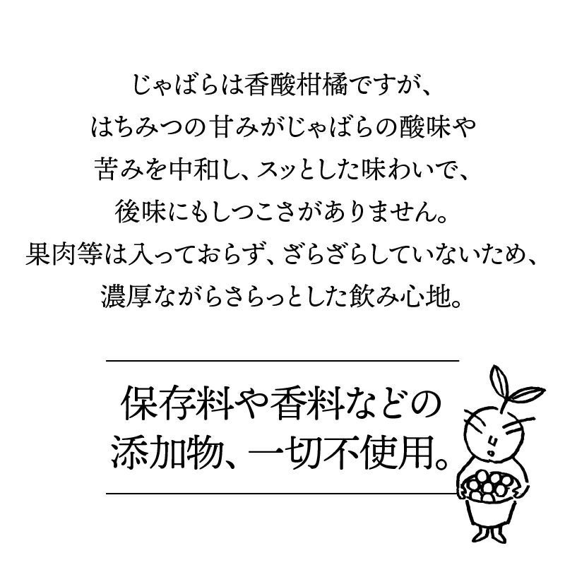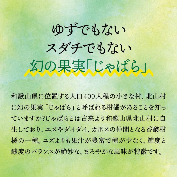 和歌山県の小さな山村「北山村」に、柚子でもない、スダチでもない、とんでもない、へんなみかんが1本だけありました。その名は「じゃばら」。鬼も逃げ出す酸っぱさからか、はたまた松のような不思議な香りがするからか、それは定かではありませんが「邪気を払う」、そんな意味でこう呼ばれていました。たった1本の木から、過疎化の救世主として大事に、大事に育てられ、今ではその数なんと7,000本!じゃばらは、さまざまな加工品となり、山奥の村から皆様のもとへお届けさせていただいています。