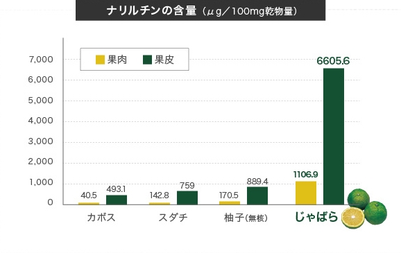 じゃばらは、ビタミンAとCの他に、カロチンなどが含まれています。そして、赤ワインなどで知名度が上がったフラボノイド(ビタミンP群)の中で、ナリルチンという成分が豊富に含まれています。実はこの成分、果汁と皮を比較すると、皮にはなんと6倍以上も入っていることから、皮まで使った商品も作っているのです。