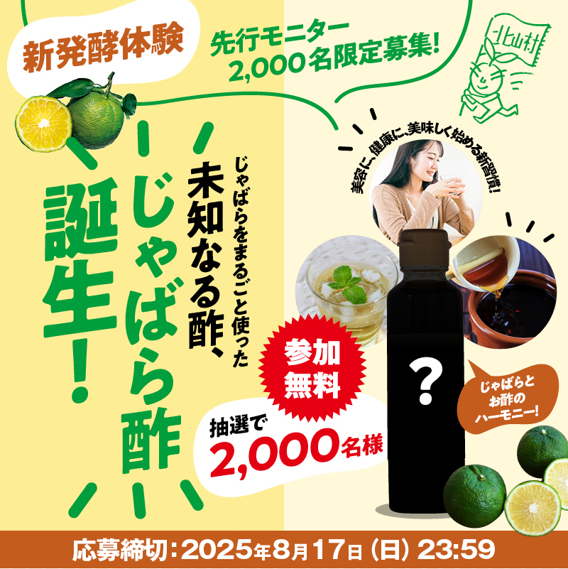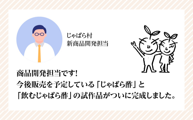 開発には、100年以上の歴史と確かな醸造技術を持つ山二造酢株式会社が協力。聖地発酵法によってじっくりと熟成され、北山村の自然の恵みと職人技が融合した、まっすぐで濃厚な"じゃばら酢"が完成しました。