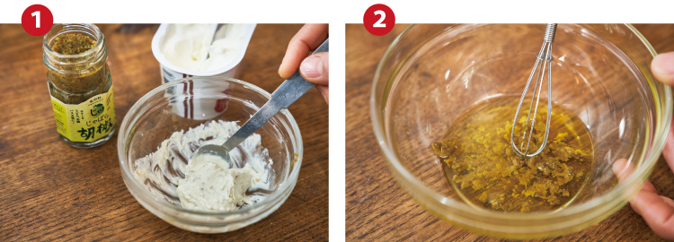 混ぜるだけでできる2種のソースは、アレンジ自在。お酒のおつまみにも。