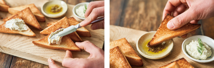 カリカリに焼いたトーストを食べやすい大きさにカットして、お召し上がりください。