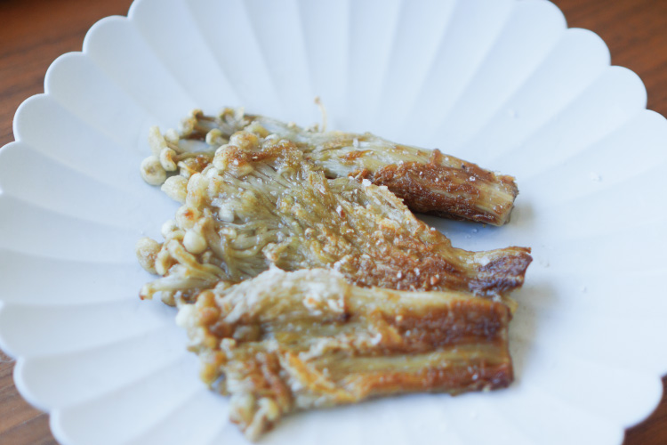 (2)米油をフライパンに敷き、えのきを焼き目がつくまで焼く。