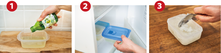 (2)容器にフタをして、冷凍庫で一晩凍らせる。