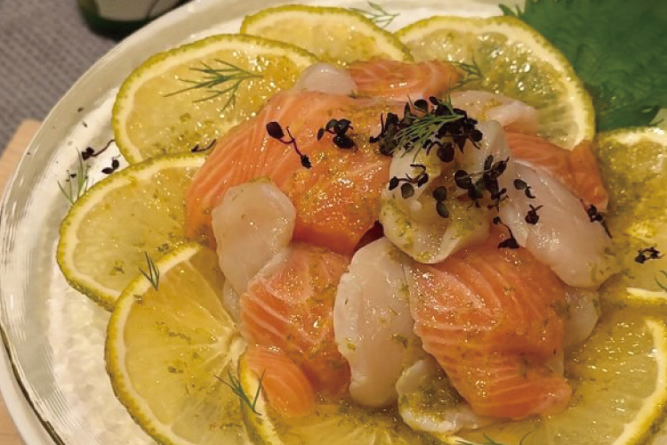 ホタテとサーモンに香り豊かなじゃばらを合わせた、さっぱり味の簡単カルパッチョです。